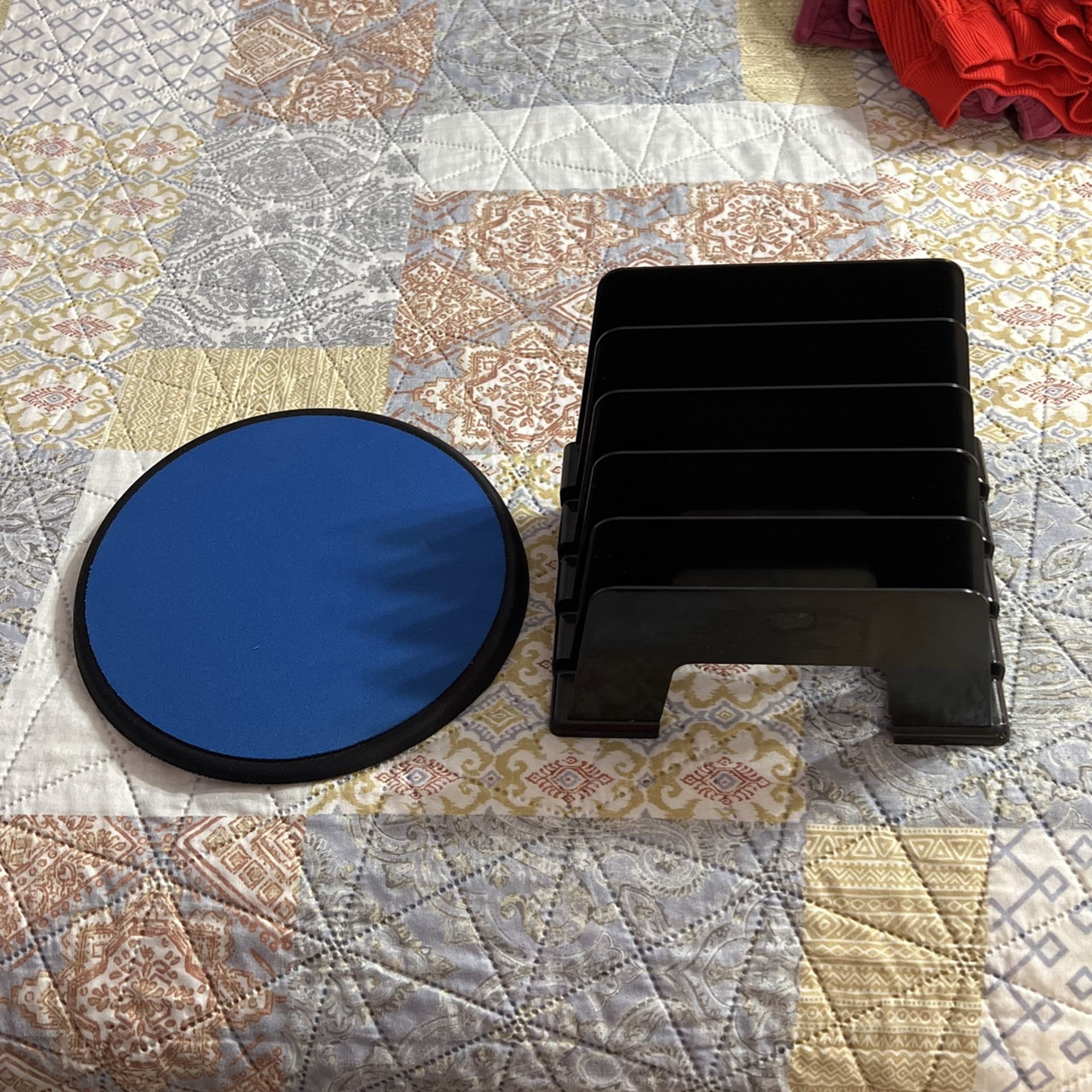 Mouse pad raised on one side and a letter holder.