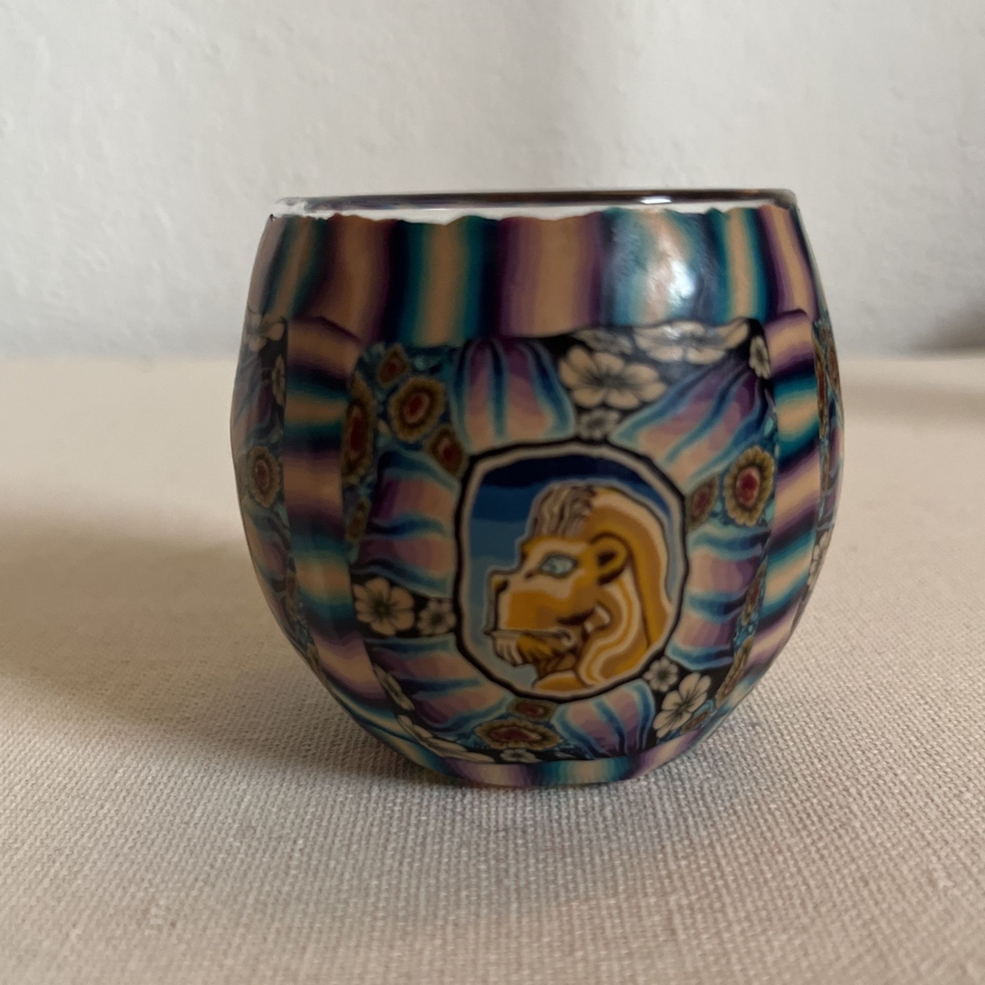 Y2K glass candle holder with outer fimo clay lining that lights up when the candle is burning (see photo). Features blue and purple stripes, daisy and sunflower pattern, and 4 lion heads. Perfect gift for the Leos in your life. 🦁