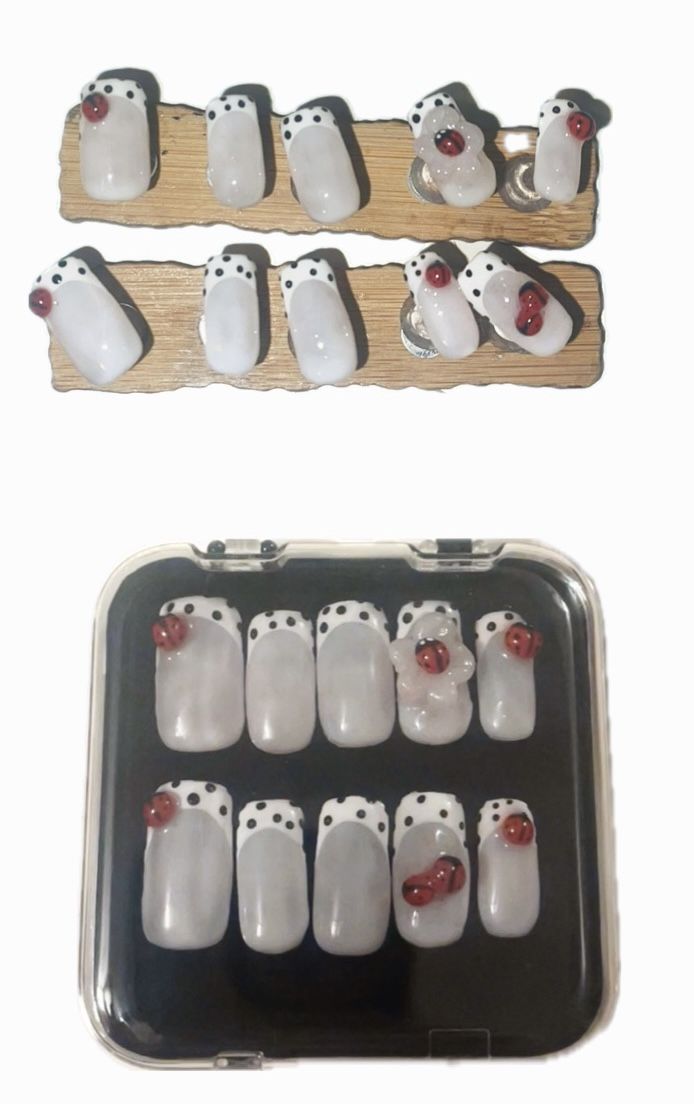 Lady bug themed handmade press ons, size L, square shape, comes with glue.ππ€π
