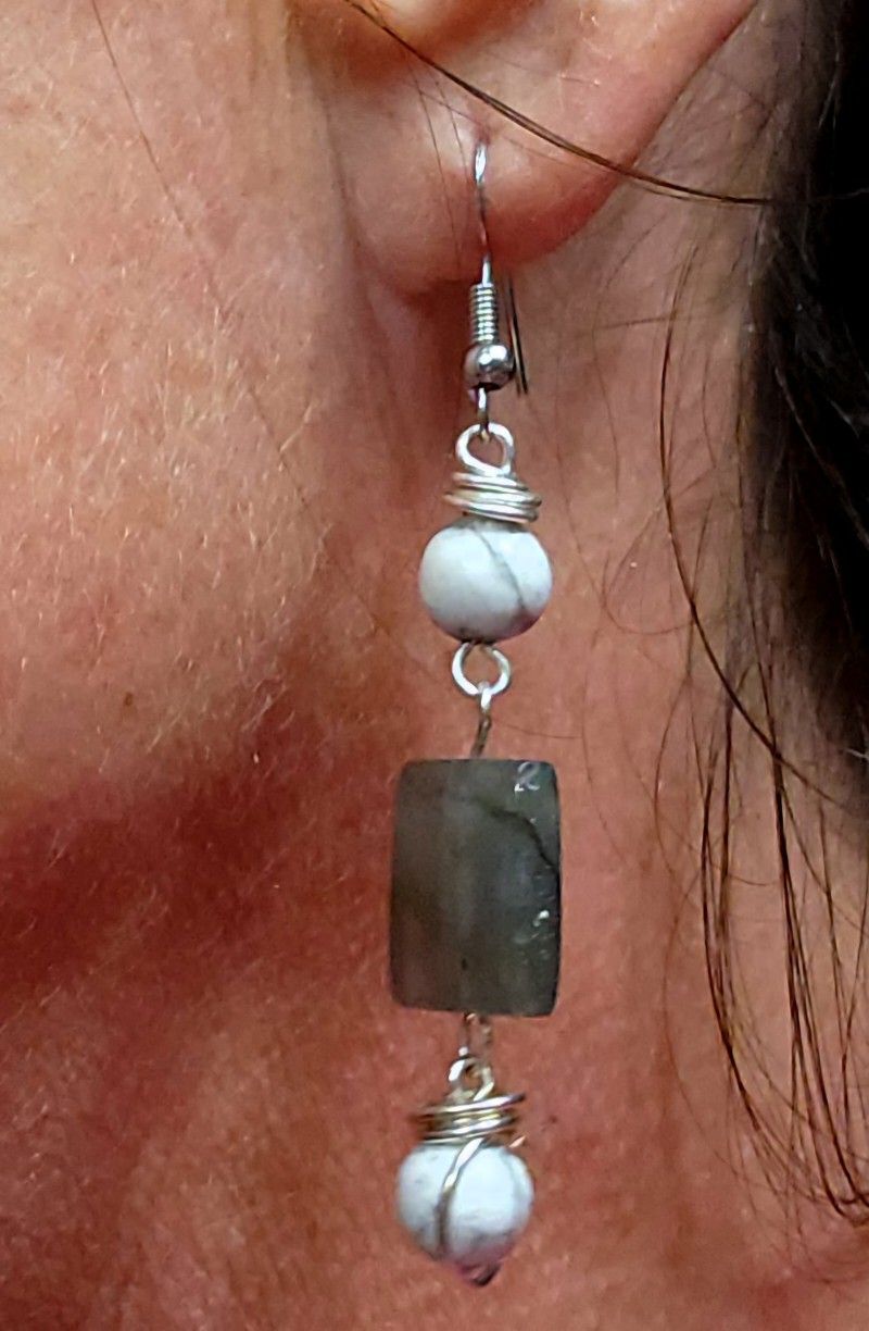 Labradorite & Howlite Silver-Plated Earrings – Mystical Balance & Inner Peace Crafted with high-grade labradorite and soothing howlite, these handcrafted earrings blend celestial energy with grounding tranquility. The silver-plated wire accentuates the natural beauty of these powerful stones, creating a piece that is both elegant and spiritually enriching. Stone Properties: ✨ Labradorite – The Stone of Transformation & Magic Labradorite is renowned for its mesmerizing flashes of blue and gold, symbolizing intuition, protection, and transformation. This mystical stone strengthens your connection to higher realms, enhances psychic abilities, and shields your aura from negative energies. A perfect ally for those seeking spiritual growth and self-discovery. ✨ Howlite – The Stone of Serenity & Awareness Howlite is a calming stone that absorbs stress, eases an overactive mind, and promotes emotional balance. It encourages patience, deepens meditation, and enhances spiritual insight. A powerful tool for those seeking inner peace and mental clarity. The Power of Labradorite & Howlite Together When combined, labradorite and howlite create a harmonious balance between intuition and tranquility. Labradorite awakens the higher self, opening the third eye and enhancing spiritual awareness, while howlite keeps you grounded, centered, and emotionally at peace. This combination is perfect for those seeking both mystical expansion and inner stability, making these earrings not just an accessory, but a wearable source of empowerment. Very lightweight!