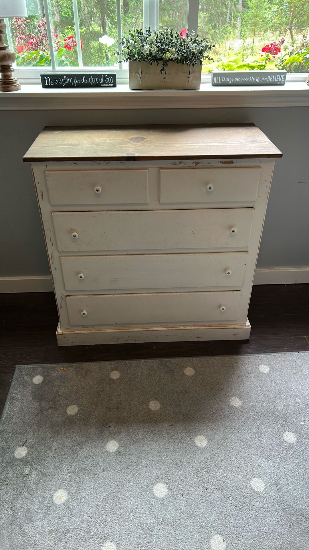 Measurements 34 1/4" W x 15 1/2 D x 34 1/4 H White with a natural wood top.