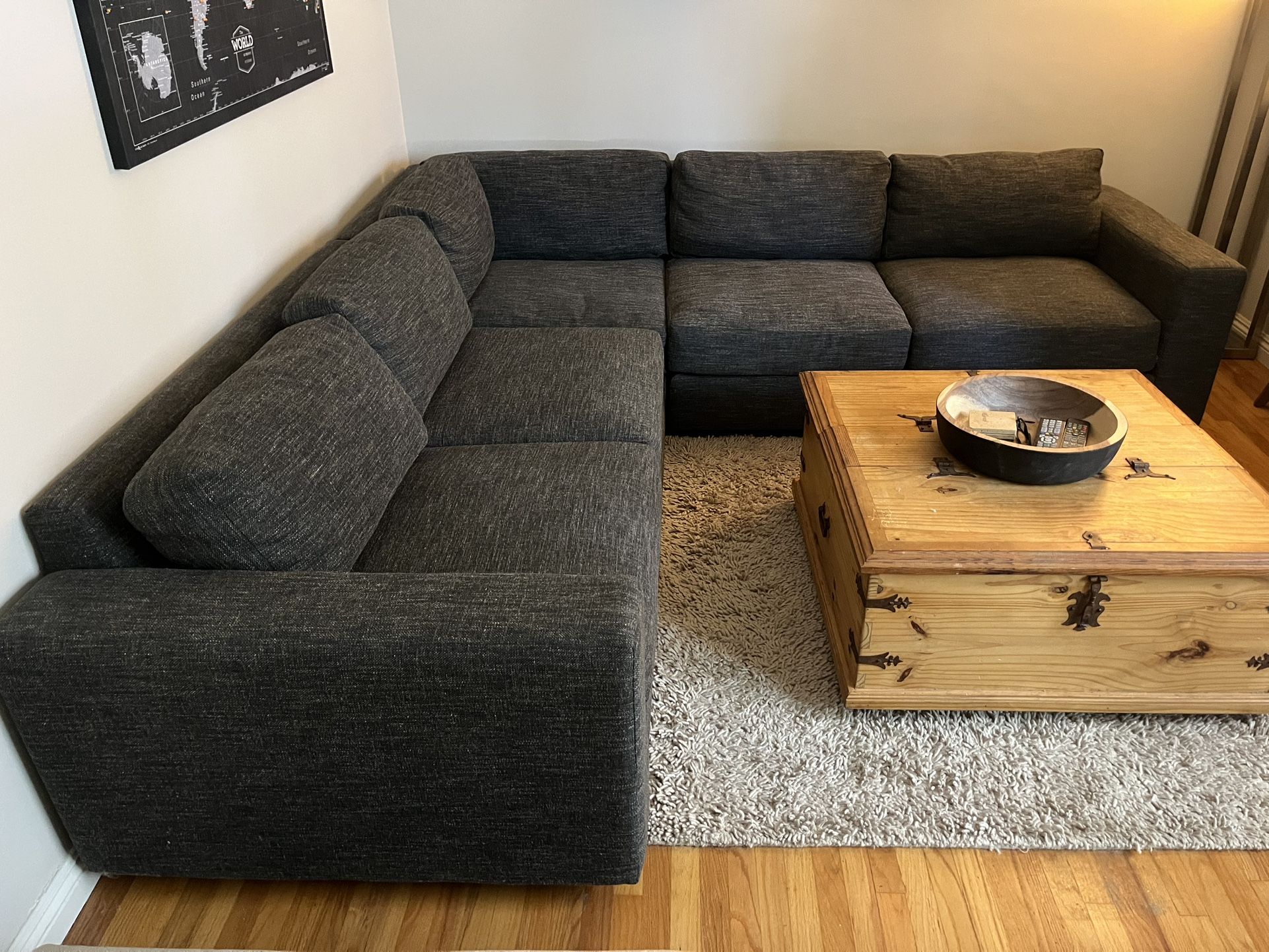 Excellent sofa, large, deep seated sofa, gorgeous fabric. L-Shape w down blend fill. Linen weave fabric is a performance fabric that is highly durable with green guard and stain resistant protection. Color in Pewter. Still sold at West Elm (a William Sonoma/Pottery Barn company) but is over $4500 for this sectional after tax & delivery. This has 3 parts for easy moving/transport and it has hardware claps to lock the pieces together. This sofa has been lightly used in a bedroom for watching tv. It has no stains, tears, snags, it’s very clean, no defects whatsoever. We are repurposing our bedrooms due to the addition of a new home office. Otherwise it’s a functional & spacious comfortable sofa that will last for years to come. Dims 106” L Shape Sectional Visit online to see: https://offerup.com/redirect/?o=aHR0cHM6Ly93d3cud2VzdGVsbS5jb20vcHJvZHVjdHMvdXJiYW4tMy1waWVjZS1sLXNoYXBlZC1zZWN0aW9uYWwtaDE1MzMv