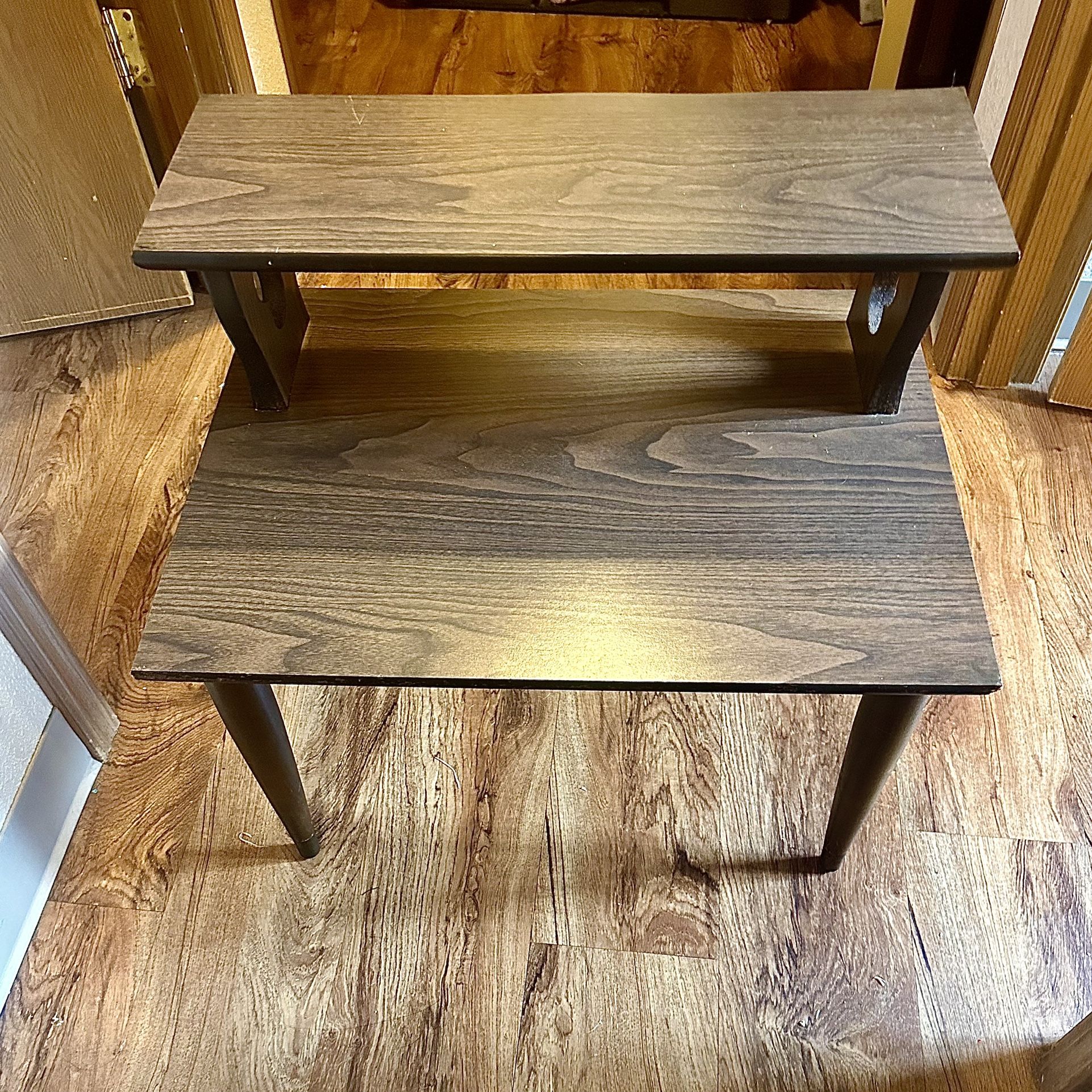 -Local meet only- Two tier solid and sturdy wood side or end table (my daughter used it as a desk/vanity under her loft bed), very well built and lots of life left. Legs are screw in and removable to sit flat on a counter top, etc (Pic 3-4). Dimensions are: Height — 21 in. (1’9”) Width — 24 in. (2 feet) Depth — 18 in. (1’6”) Top shelf —9 in. Wide Scuffs, wear/tear are shown in the pics with the top right shelf corner having a 2in. split that could be mended with wood filler/glue
