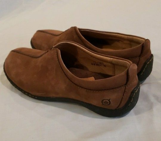 Born Tan Leather Slip-on Shoes Women's Size: 7 1/2M Materials: Leather Upper & Linings, Balan Man Made Materials Excellent condition. Signs of use from normal wear. Great Tread exists, lots of life left. Tag on bottom sole is slightly peeling. See pictures for details. Local pick-up, Cash only