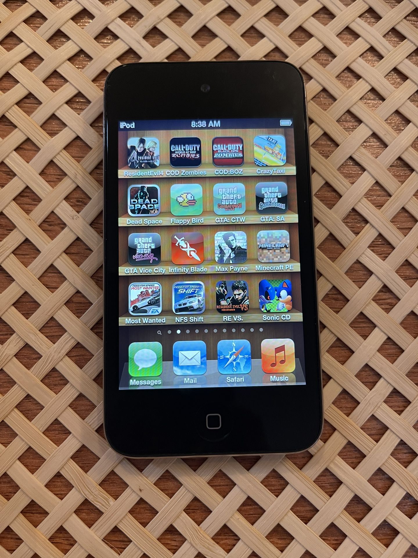 Apple ipod touch 4th 32gb black With 160 classic games from 2007-2014 these apps no longer available in the apple store Flappy bird, resident evil mobile, call of duty zombies, sonic, silent hill, infinity blade, grand theft auto, need for speed, tons of sega games This ipod is outdated the Apple Store no longer supports them you can’t download newer apps on it , but they are still good to use as a music player ,camera, alarm, notes, etc . Everything is still working great , it may have normal scratches overall in good condition Batter life is unknown, seem holding charge alright since they are over 10 year old To connect to Wi-Fi, use the 2. 4GHz Wi-Fi connection instead of 5GHz , it connects with mobile hotspots just fine, Comes with a charging cord and wall plug .