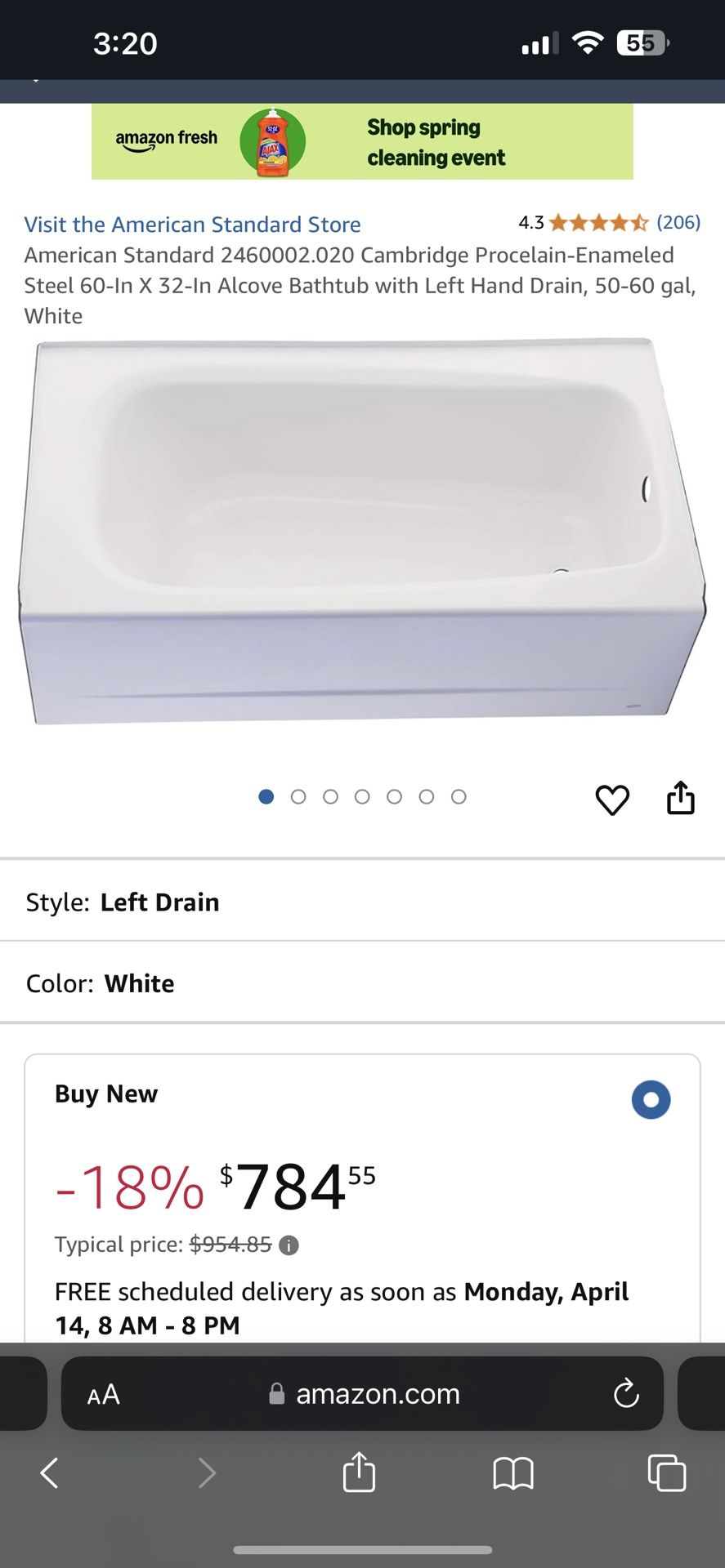 Color White Material Porcelain, Polymer, Steel Brand American Standard Product Dimensions 60"L x 32"W x 17.7"H Style Left Drain Finish Type White Easier to clean and stays cleaner longer A brighter, white textured surface that is more visually appealing Covering 56% more of the tub floor to help increase bathroom safety Padded carrying bars and leveling grid for easy installation