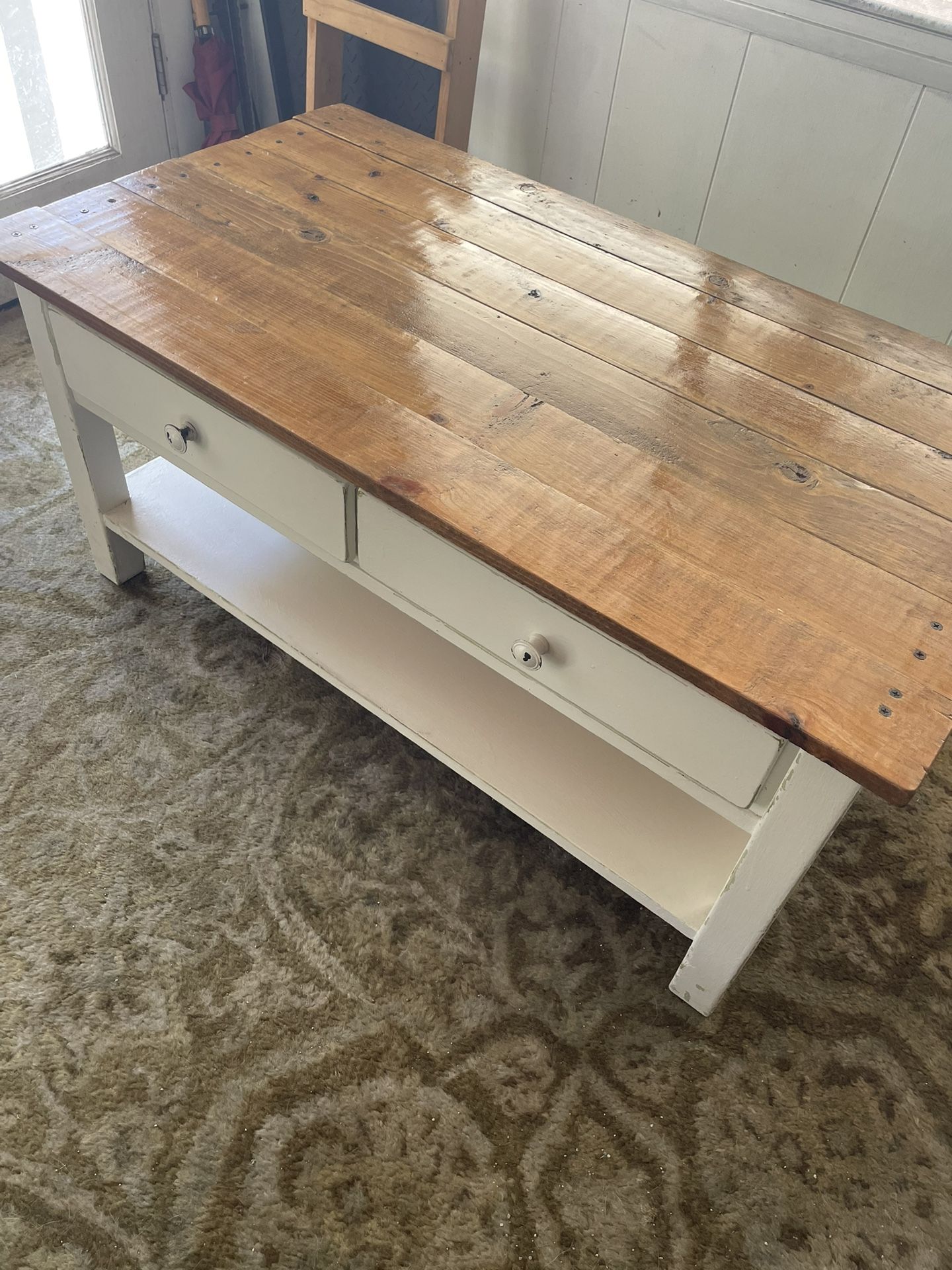Super cute smaller size rustic coffee table. Measurements in photos. 2 drawers. Looks like it was sage color at one time and painted white (not by me). I bought it and it didn’t work in my room. Price is firm.