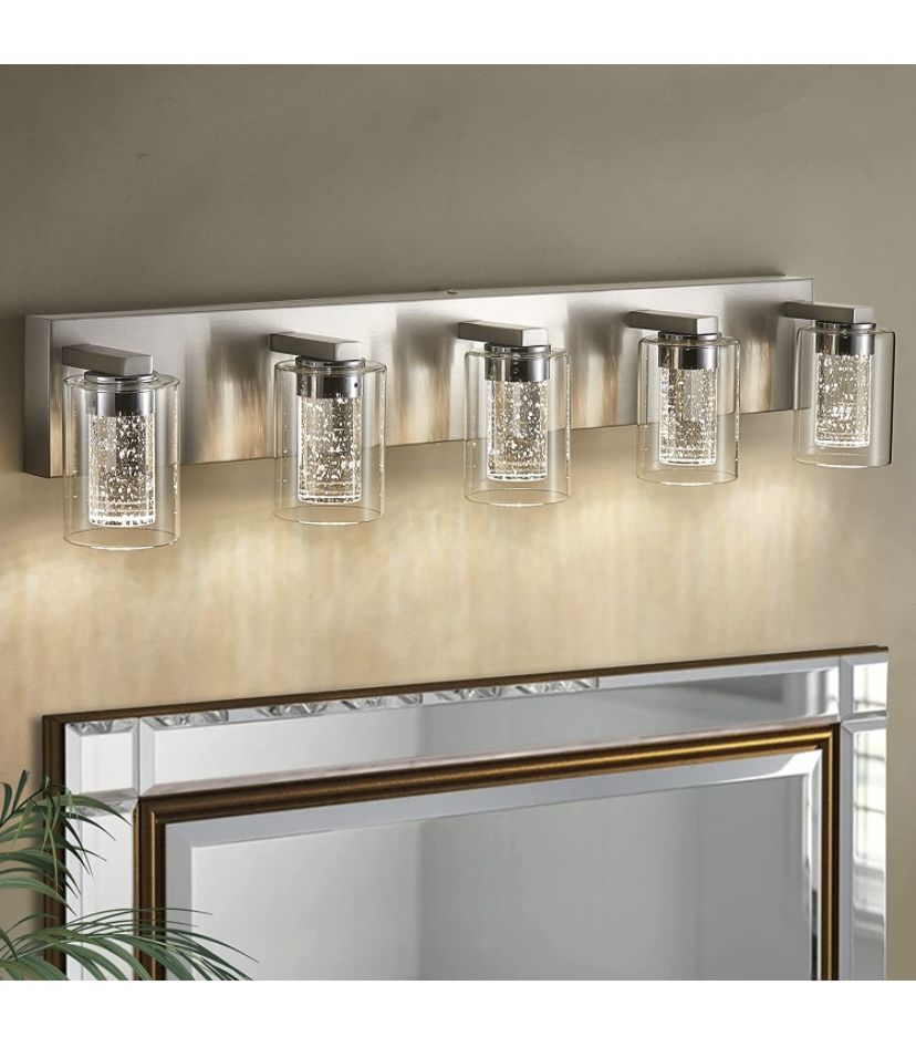 Bathroom Light Fixtures, 5 Light Brushed Nickel Bathroom Vanity Light, Crystal Bubble Glass With Dimmable 3-Color Lights, Modern Bathroom Wall Sconce