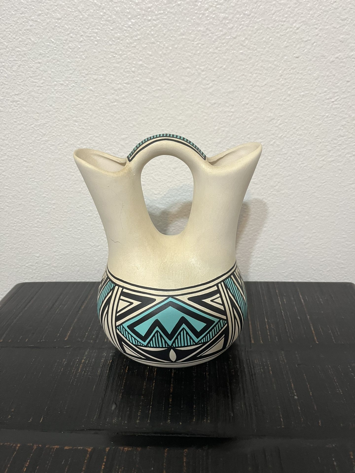 This is a Native American wedding vase, likely a vintage Navajo piece. Used in ceremony the two spouts represent the husband and wife, and the shared base symbolizes their shared lives. The loop handle represents the circle of life. Very beautiful. From around 1996.