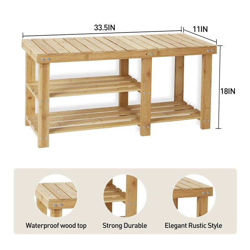 Brand new in box, Amazing value, all hardware include and very easy to assemble. This 3-tier bench functions as both a shoe rack for organization and a bench for sitting, ideal for entryways, hallways, or other areas with limited space. It is constructed from natural bamboo, offering durability and a natural aesthetic. The bench provides three tiers of storage, capable of holding shoes, bags, or other items, and the top surface can be used for sitting while putting on or taking off shoes. The dimensions are approximately 33.5 inches long, 11 inches deep, and 18 inches high.