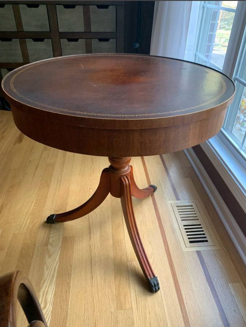Classic English/Federal style drum table with gold-tooled leather top. Warm mahogany-tone case, one drawer, turned pedestal with four curved legs, metal paw feet. Structurally solid with no wobble; leather shows honest wear as pictured. Dimensions: • Diameter: 28” • Height: 28” • Knee clearance (to apron): 25” Note: Lamp and clothes not included. Pickup/Payment: Ground-level pickup; buyer handles transport. Cash only.