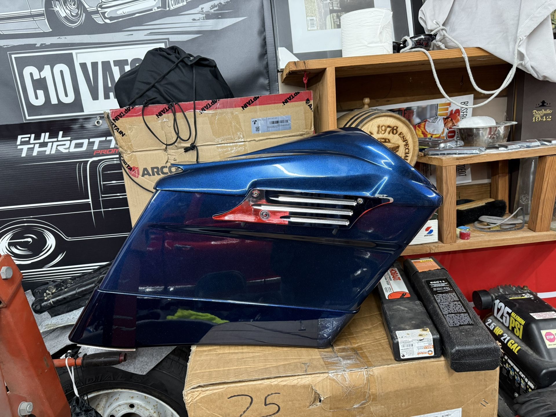 Right side Harley Davidson hard saddle bag. Comes with prepped for 8” speaker hole on lid and prepped for a 2nd 8” speaker inside bag. NO speaker included. I believe como is called big pearl blue. Bag is off a 2012-2013 Street Glide