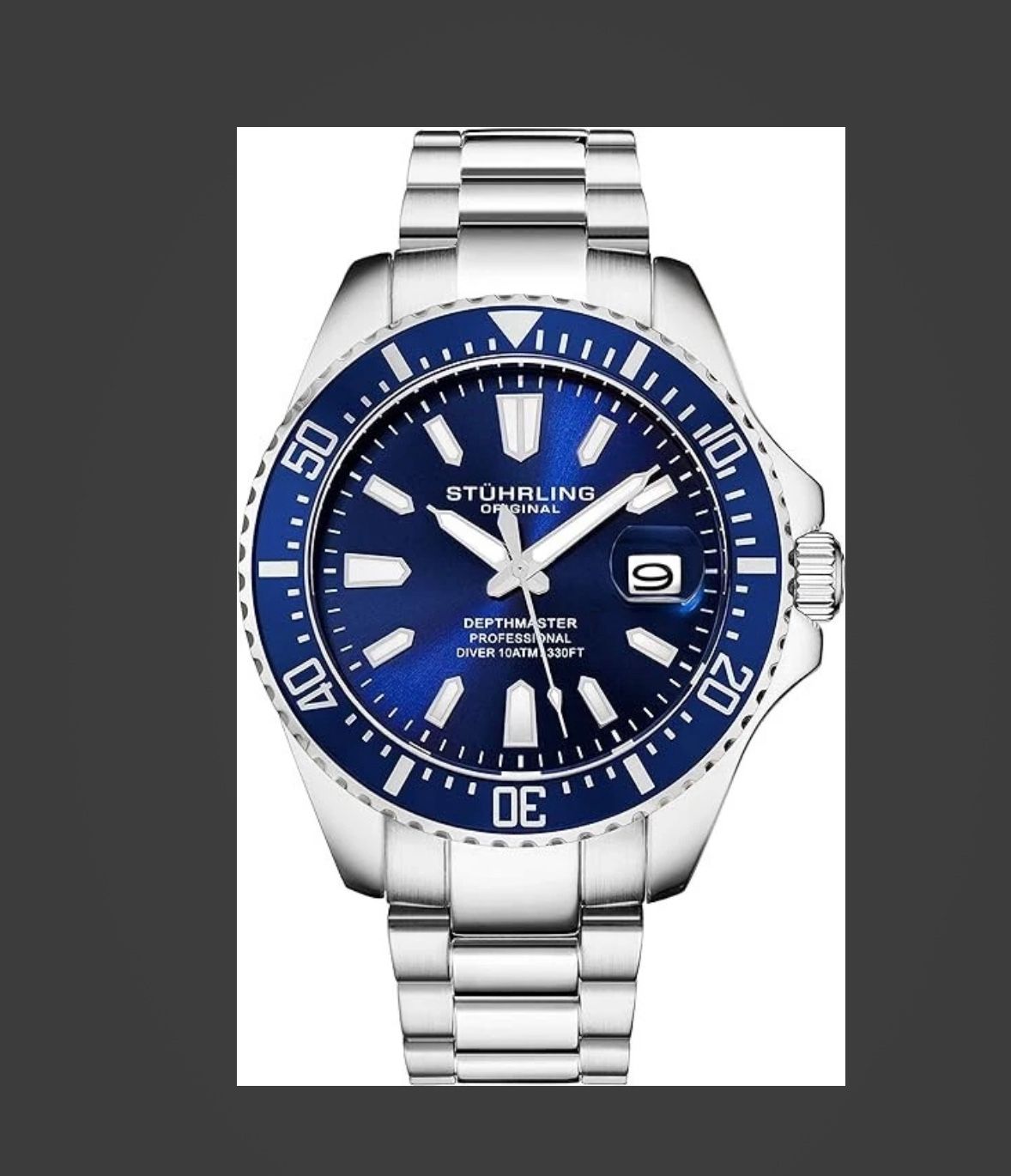 Stuhrling Original Men's Watches Blue *LUXURY WATCH MODEL A3950.2 made in Japan Pro Dive Watch Sports Watch with 42 MM Case Blue Dial Stainless Steel Silver Bracelet Diving HIGH QUALITY / WITH BOX AND ACCESORIES Watch luxury * Quality +A --------------------------------------------------------------------------------- *LUXURY / NEW + BOX *LIMITED EDITION / watch unisex / Luxury + NEW // MODEL A3950.2 Made in Japan LUXURY PRODUCTS / MODEL > A3950.2 Easy to read luminescent baton style hands and indices collected in a coin edge bezel and finished with a signed screw down crown Polished finish deep sea blue dial watch and stainless steel unidirectional bezel with coin edge detailing Stainless steel watch bracelet with polished center links and brushed outer links and stainless steel push button deployant clasp with safety cover Protective and scratch resistant Krysterna Crystal, Stuhrling Original specialty quartz movement Professional diver watch with screw down crown and water resistant to 10 ATM 100 Meters 330 Feet suitable for professional marine activity and serious surface water sports. Product Dimensions : 5 x 6 x 5 inches; 15.2 ounces Item model number : A3950.2 Department : mens Date First Available : June 21, 2023 Manufacturer : Stuhrling Original ASIN : B0C8WKTZQL Country of Origin : Japan + Enjoy THANKS for your business + SALES ARE FINAL///// NO RETURNS /// NO RETURNS /// NO RETURNS // NO RETORNOS Shipped with USPS First Class