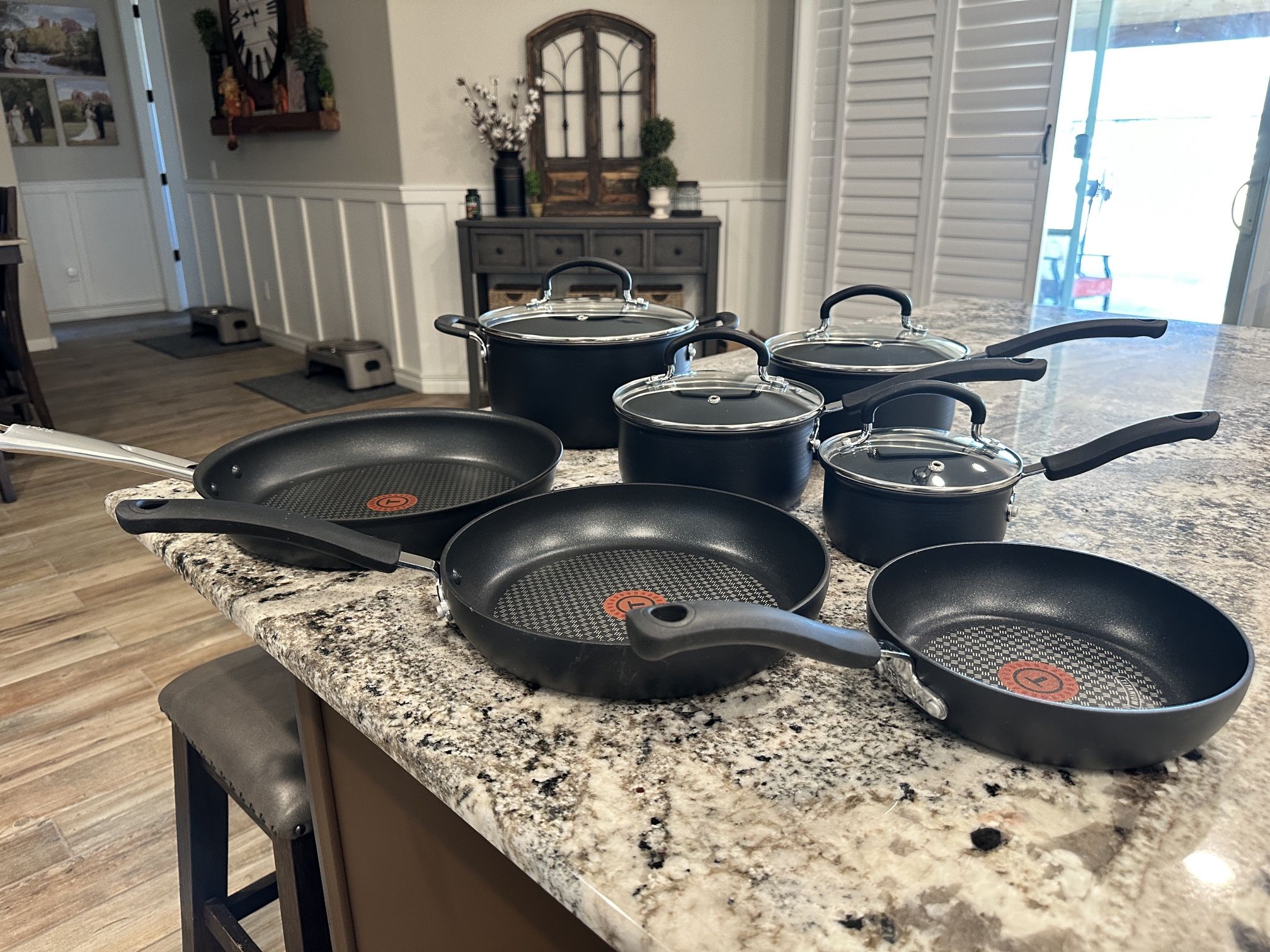 T-Fal hard anodized titanium nonstick cookware set - 11 pieces. Oven, broiler and dishwasher safe. Comes with 8”, 10.5” and 12.5” frying pans along with 1 qt., 2 qt., and 3 qt. saucepans and a 5 qt. stockpot, all with lids. Silicone handles and vented lids. Set is only 5 months old. I love this set but I just purchased a new induction cooktop and these are not induction, or else I would definitely keep them. No scratches or dents. Paid $290 for the set.