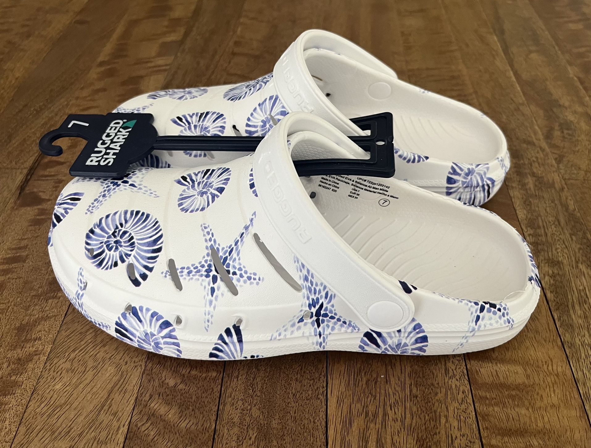 Cute Rugged Shark crock like slip on shoes new with tags. Size 7 women’s. White/Navy