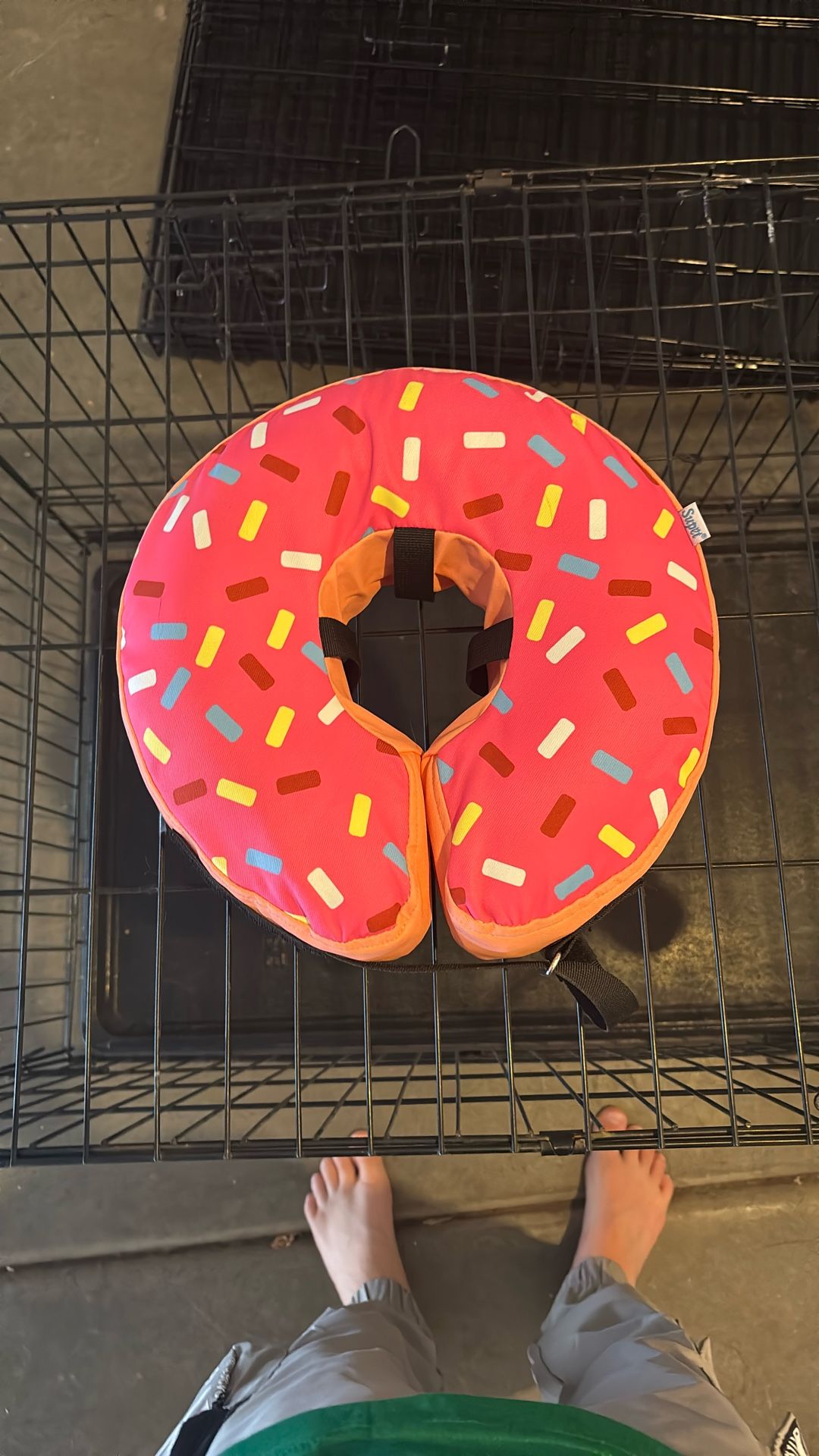 Medium size SCRATCH & BITE RESISTANT - This inflatable dog collar is a perfect dog cone alternative after surgery. Inflated dog neck donut works like a plump barrier around your canine's neck, can effectively prevent your pets from biting and licking injured area or surgical site. With this collar on, the unique and cute donut shape makes it like a pet ornament instead of a dog surgery collar, your pet must be a million times happier with this. NON-STICK FABRIC - Unlike other common velvet dog inflatable recovery collar, the outside of this dog donut cone collar is made of upgraded non-stick fabric, then you won't have to keep cleaning pet's hair frequently. Also it is easy to clean if needed, just unzip to take off the outer cloth. Soft cone collar for dogs after surgery keeps your dog comfortable, can even act as a neck pillow which helps him/her fall asleep quickly and forget the pain of the wound. NO STRESS - We all know how pets hate the cumbersome cone, poor dogs and cats would keep tripping on it and could not get around. This inflatable cone collar for dogs WON'T let that happen, the inner air bag provides full support for the neck while keeping it lightweight. It does not block dog’s vision like traditional Elizabethan collar, which allows your doggie chase butterflies, hummers and grass hoppers all with wearing its collar. ADJUSTABLE &PERFECT FIT - In case you are concerned of the dog recovery collar from slipping down or getting taken off, we designed a fixed position on the inner part of the ecollar dog collar surgery, just thread your pet's everyday collar through the strips to fix it. Furthermore, a hook and loop strap is equipped on the opening of the collar, which can allow you to adjust the the tightness to ensure a perfect neck fit.