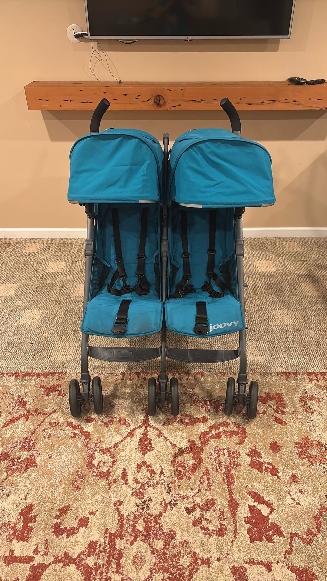 Double umbrella stroller by Joovy. Used in very good condition just some staining on end of the fabric. Folds up very compact and easy to fit in the car. Has a lot of storage pockets and cup holder spots. We used this for our kids for quick trips and traveling and it worked great.