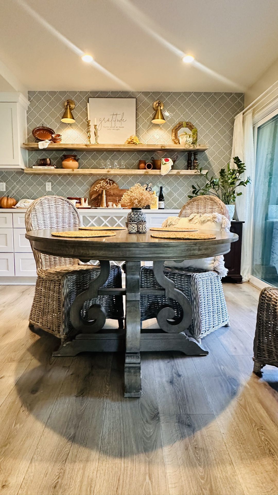 Located in Rancho Bernardo! This is a gorgeous dining set available for you to pick up today! Round table is 48” and is made of real wood in a Grey tone. Chairs are of durable Kuru in white wash. This whole set that we put together retails over $1,300. It has been loved therefore wear does show on table not on the chairs though. Note: Dimensions are in photos.