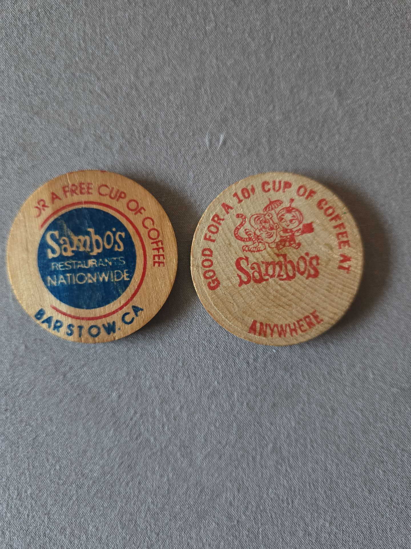 2-Sambo's wooden nickel tokens for coffee