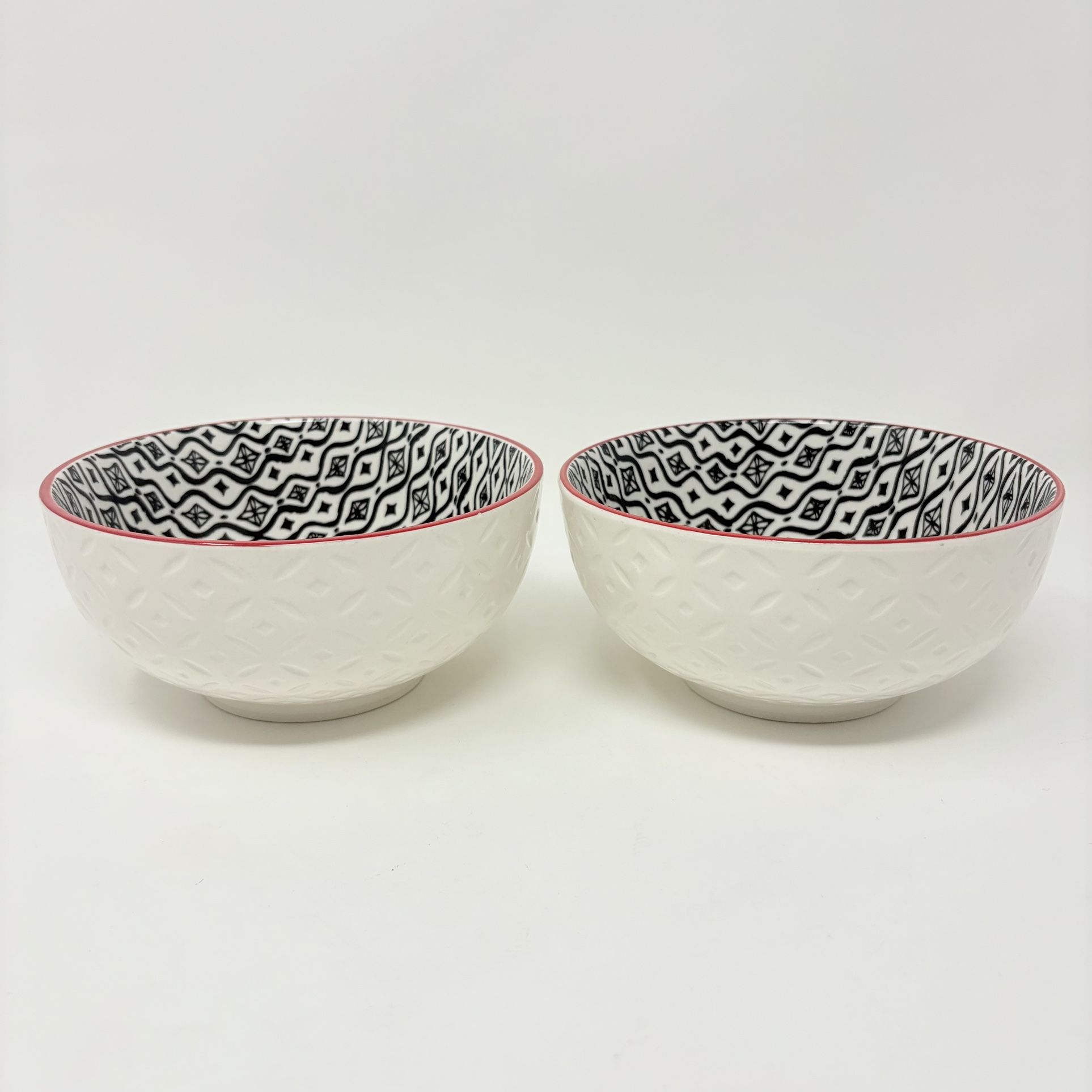 White Stoneware Set of 2 Soup Bowl Cereal Bowls 5 7/8" Relief Geometric Pattern