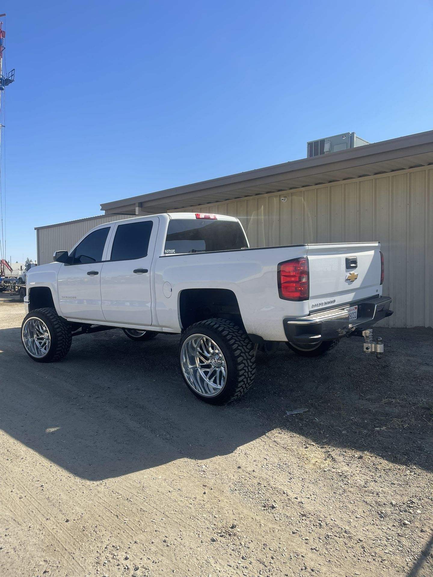 2014 Silverado crew cab 2WD Clean title 5.3 V8 106,xxx miles Brown and tan interior 7-9” lift 24x14” hostile forged wheels Aftermarket k&n air intake Viper alarm 2-12” kicker subwoofer custom box Tuned by calspeed Title in hand Trade Or asking 17k obo