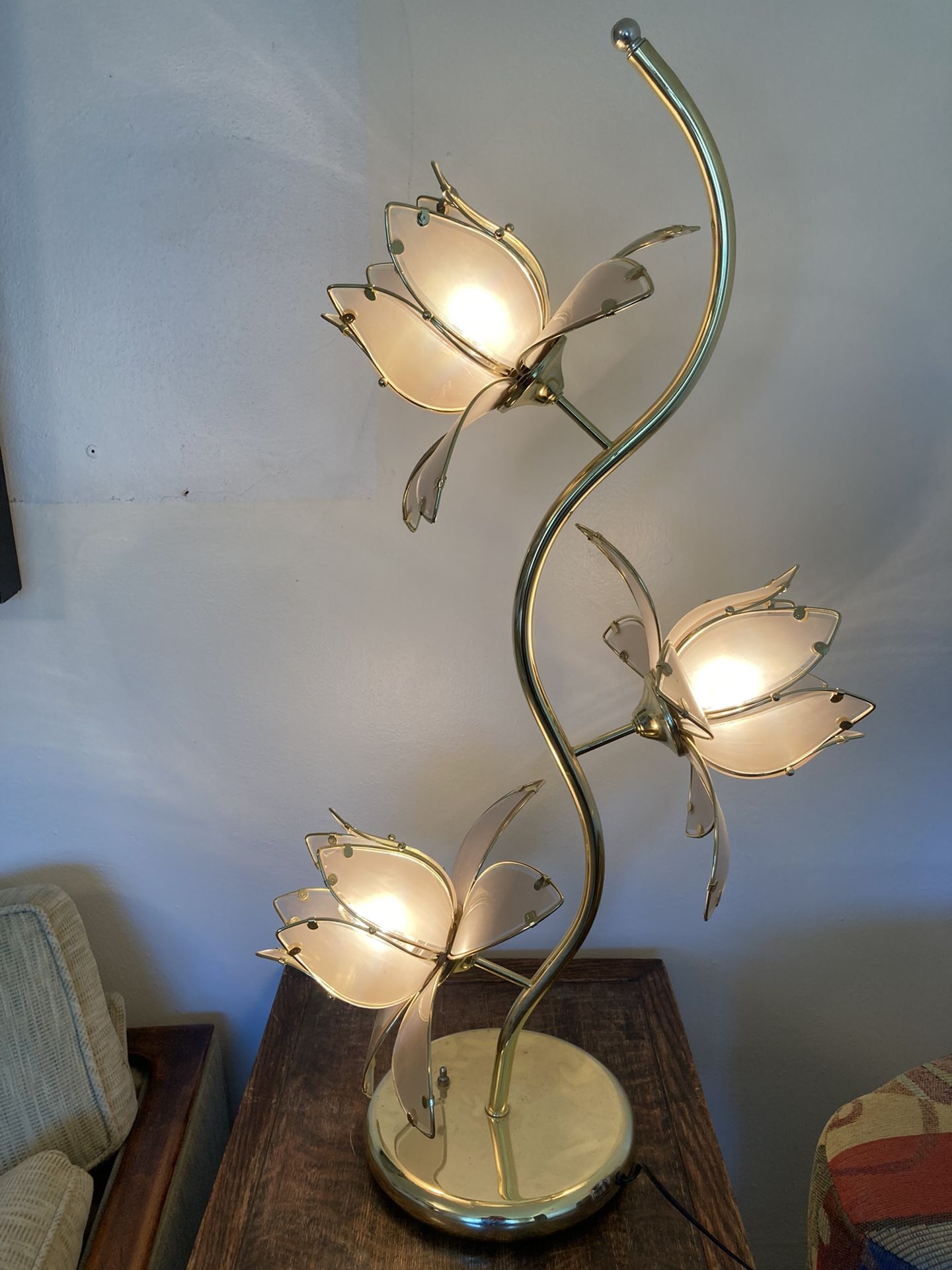 Very cool lamp. Stands just under 40 inches tall. Has three active settings that allow each flower to light up individually depending on your preference. Glass flowers are in fantastic condition. Brass finish has some wear spots throughout. All lights work as they should.