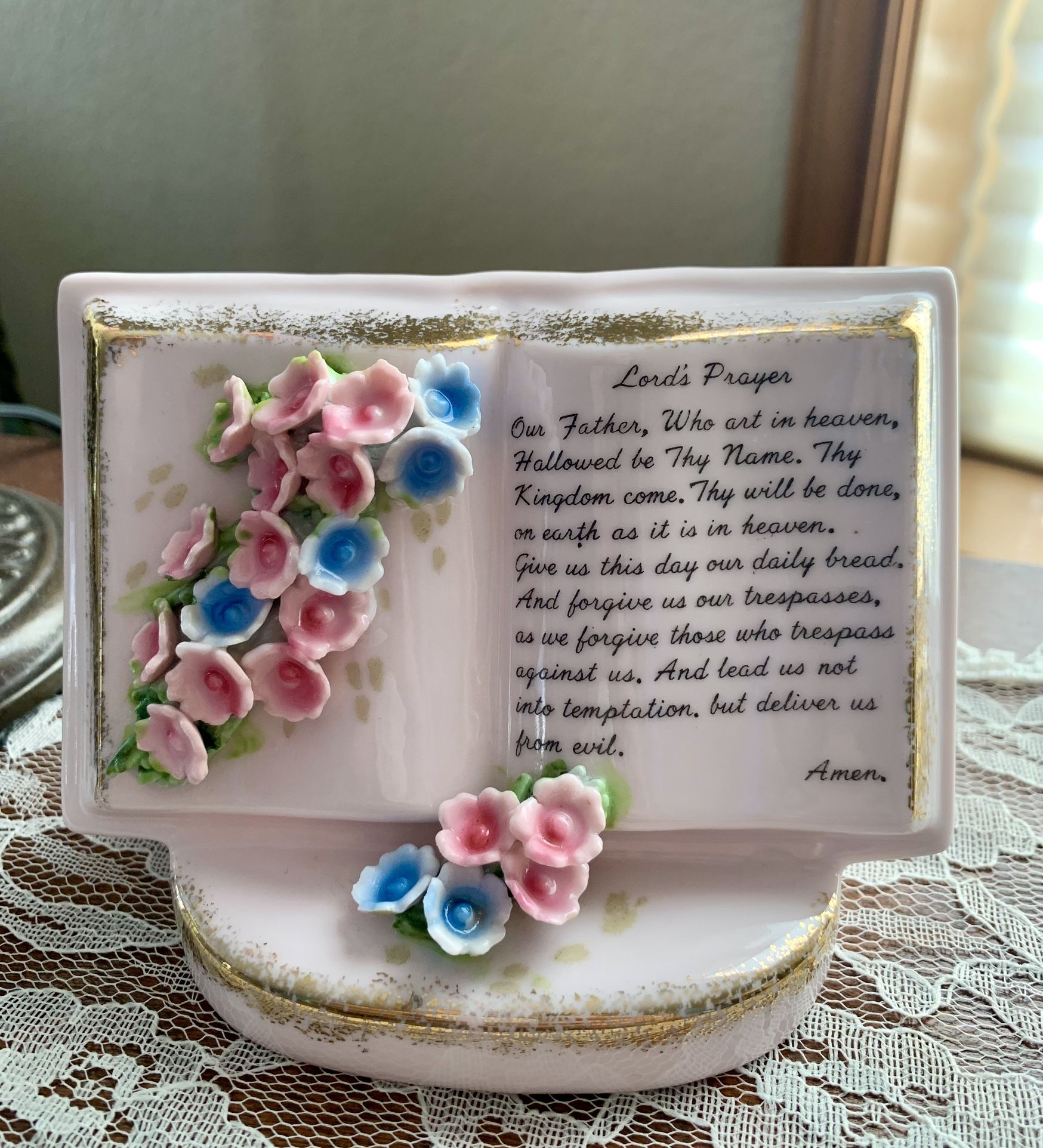 Ceramic planter with The Lord’s Prayer. Peddles are in tack, the planter looks white in the photo, it’s not tho. The planter it self has a soft pink color to it, it’s a beautiful planter. I have two and keeping one, no chips, cracks, or crazing that I can see. It’s made by Lefton, would make a nice gift.