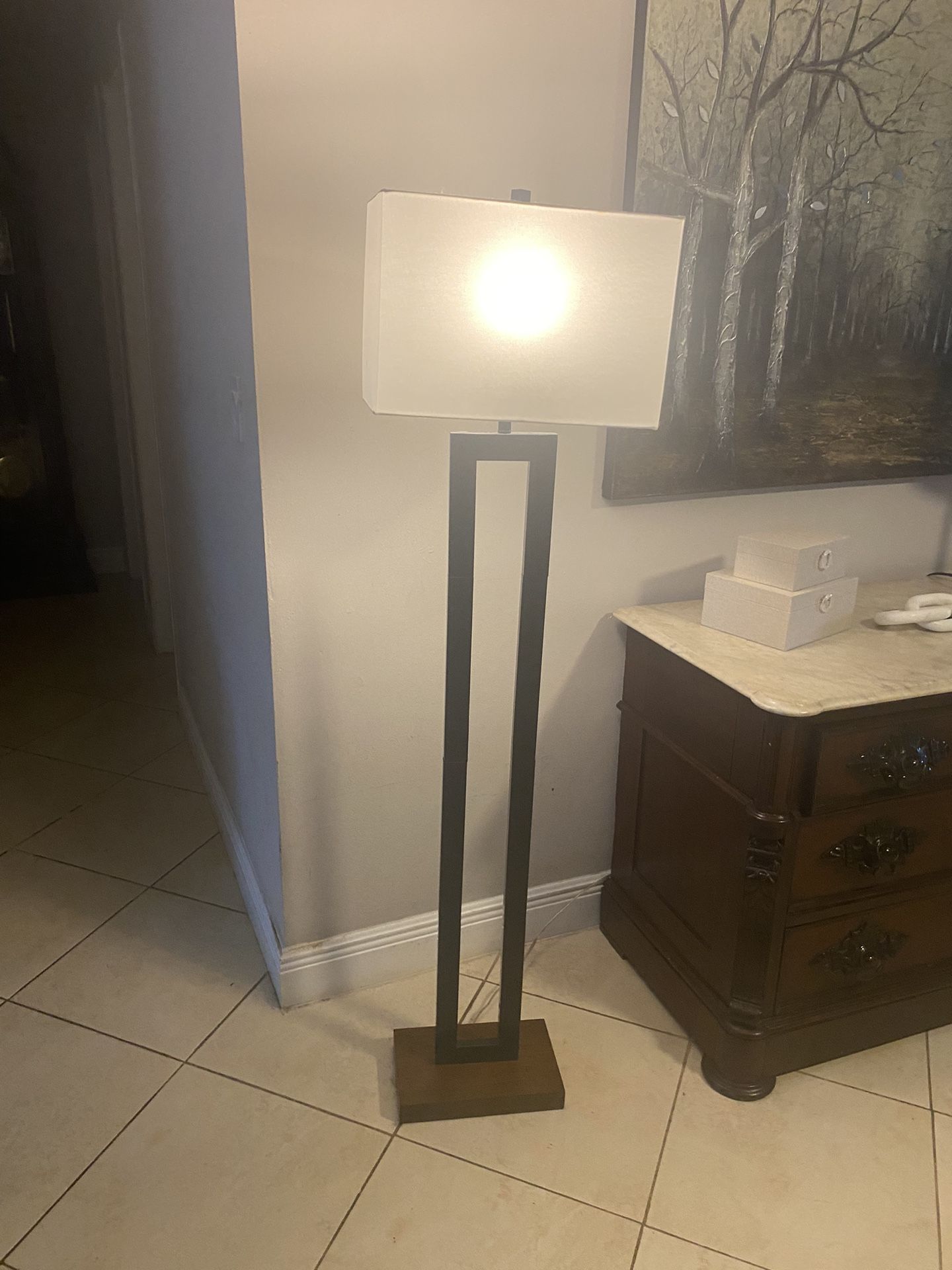 Functional and stylish, Floor Lamp features a rectangular white shade and a weighted black base for stability. The lamp can be turned any direction and the three-way switch lets you control the mood.
