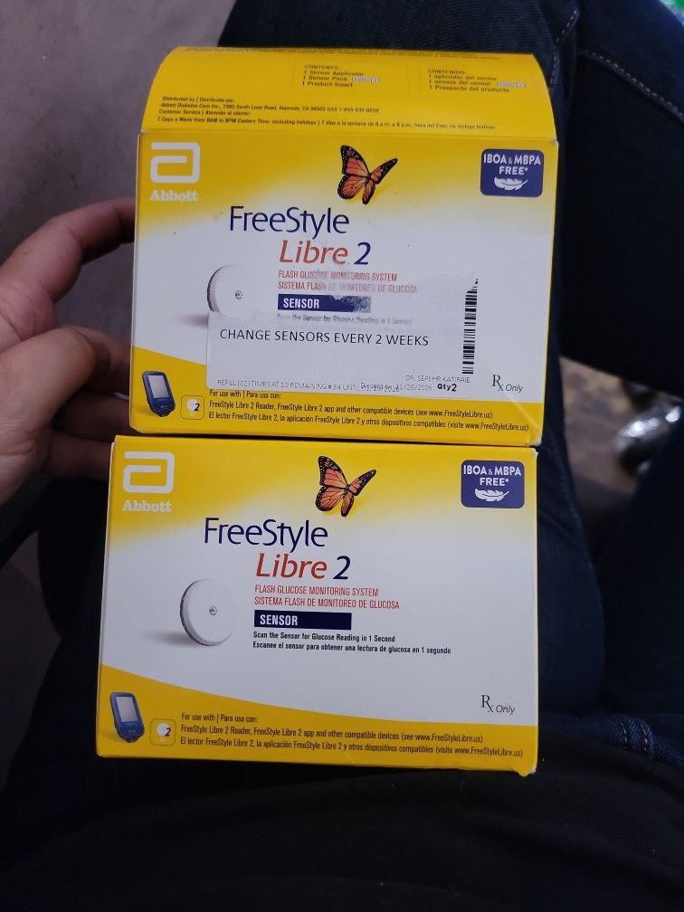 Freestyle Libre 2 sensors 2 of them 1 box sealed 2nd box got torn open, but everything inside is sealed and brand new. Expiration date on both boxes: 4/30/2026 $60 for both or $35 each