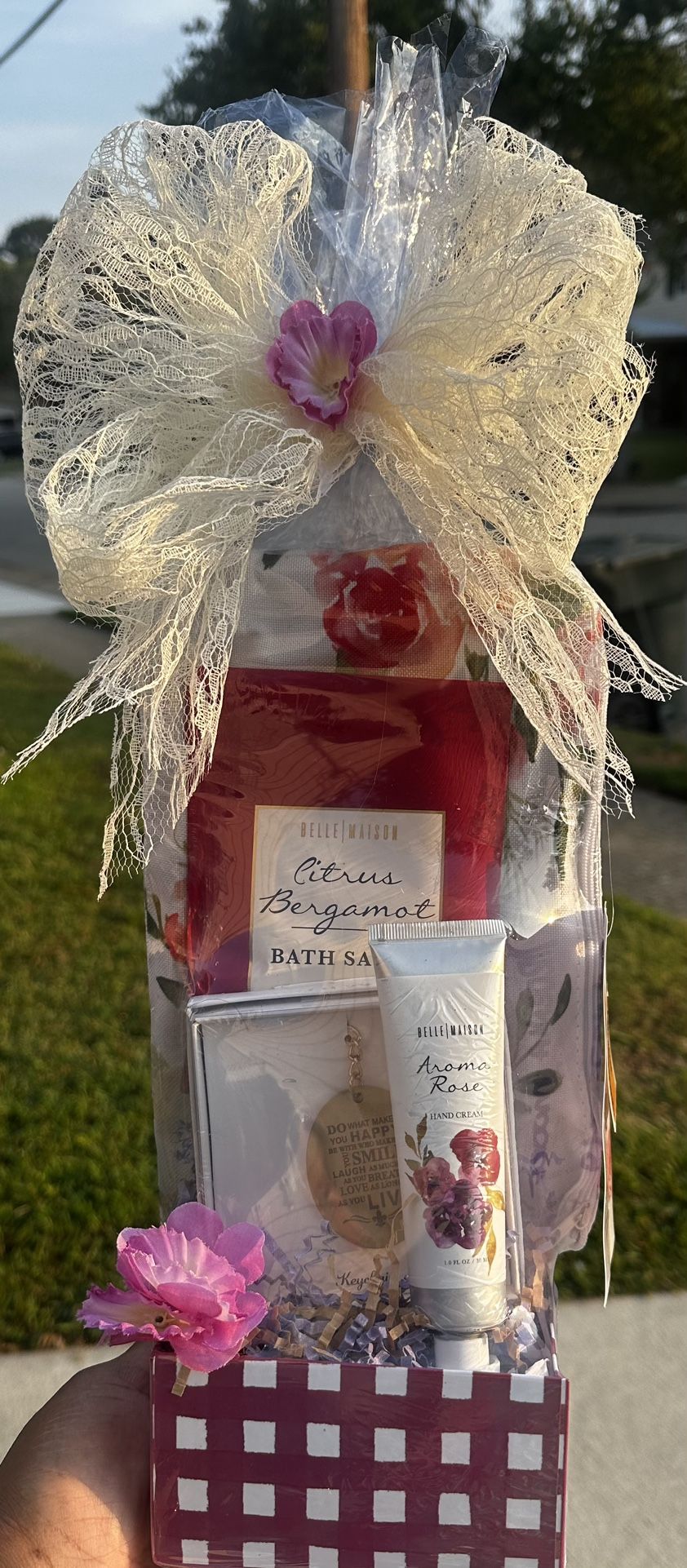 Cute Gift box -cosmetic bag -scented bath salts -inspirational keychain -scented hand cream