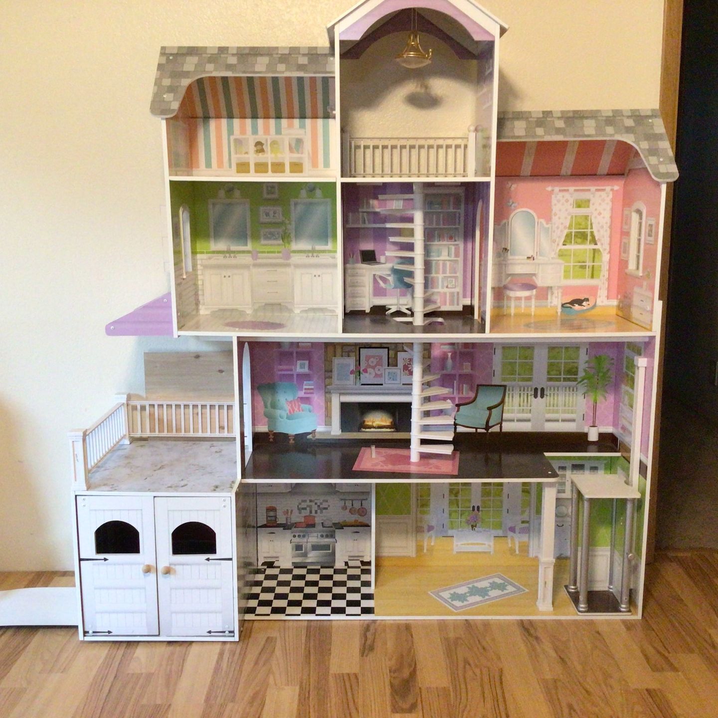 MADE OF WOOD: Crafted of premium wood construction and with a timeless, cheerful design with the intent to be passed down from kid to kid. FOR BIG IMAGINATIONS: Standing at five feet tall, this mansion provides an impressive 4 levels and 11 rooms for multiple kids to play without getting in each other's way. HANDS-ON PLAY: From moving the elevator up and down between floors to opening and closing the double garage doors, there's plenty of role playing for kids to experience. FULLY FURNISHED: Includes 34 pieces of durable accessories so kids can make the house a home and redecorate over and over again