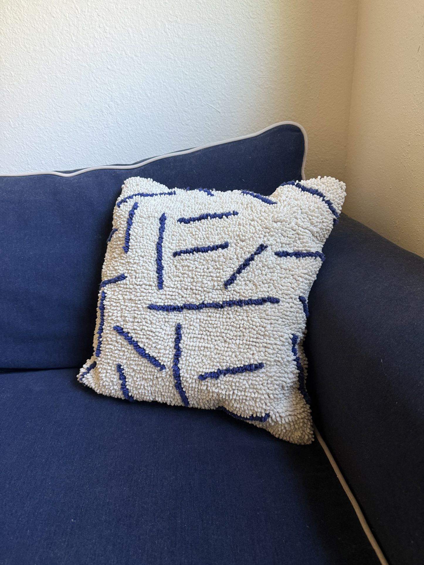 Decorative Throw Pillow. Off-White Plush Material with Blue Accent Lines. 18in x 18in x 5in Case is not removable.
