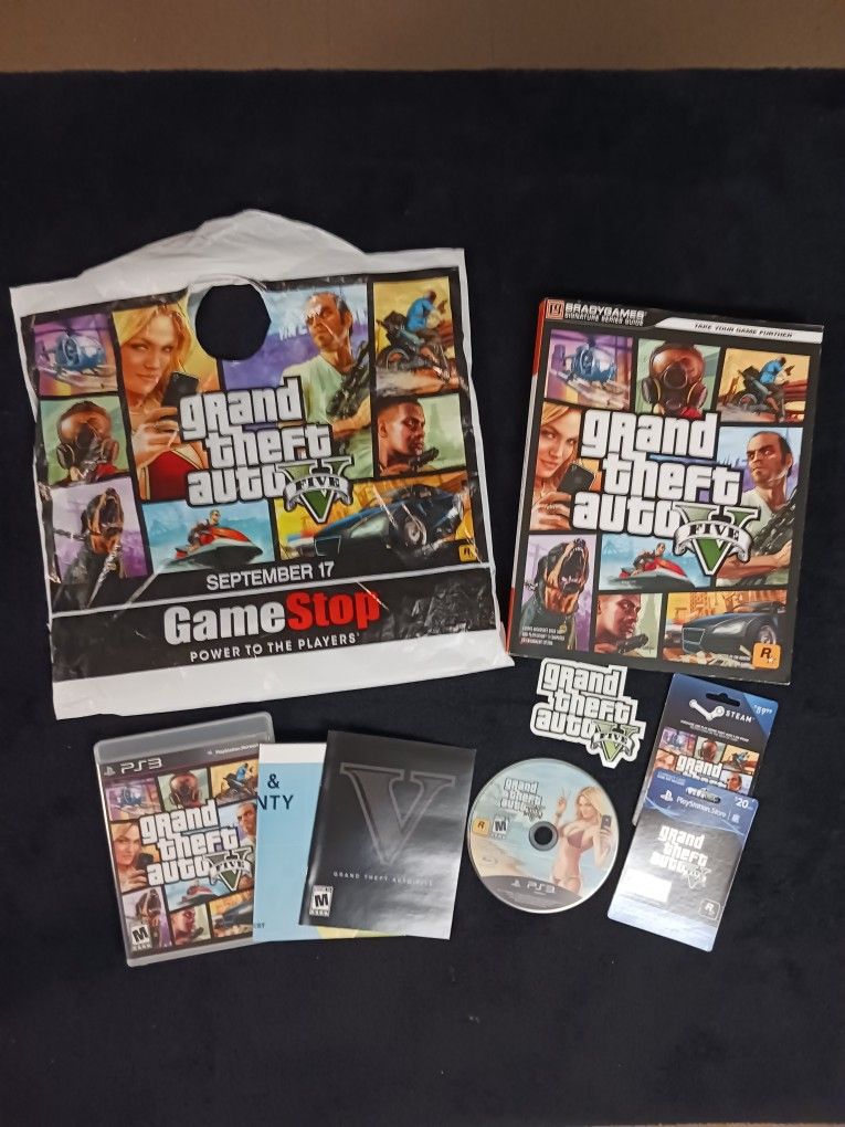 This is a Grand Theft Auto V Collection with rare collectors bag from GameStop a $30 Brady games strategy guide in mint condition a copy of Grand Theft Auto V complete with map and manuals disc is in mint condition along with everything else is flawless other than the bag has some wrinkles in it as normal where and I'm including an ultra rare Grand Theft Auto V sticker sheet set and this is this game received a 10 out of 10 review and is literally in the world π records book as the best selling media item ever produced so if you never got the chance to play this game it's a must have and if you did have it and got rid of it now's your chance to reclaim it and all its Glory the Brady game strategy guide is amazing as it has over a few hundred vehicles including helicopters planes boats muscle cars sports cars Exotics Etc and maps to the entire city which as you know San Andreas is one large city my asking price for the lot is $50 which is a bargain considering I paid near that for the game alone when new Cash and Carry only thanks for looking and Merry Christmas
