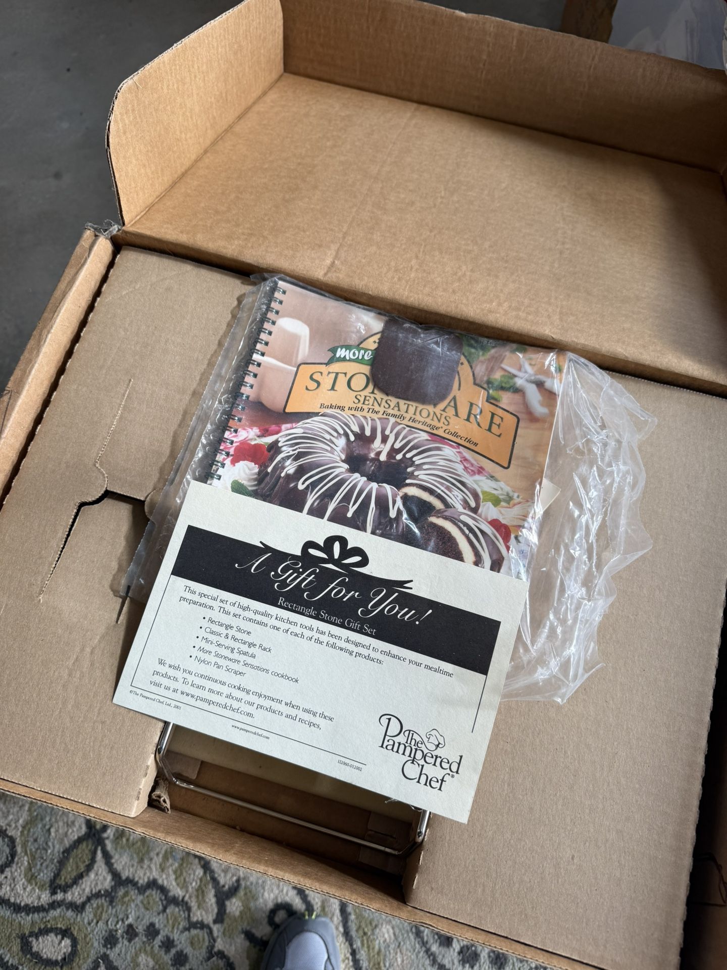Brand new Pampered Chef baking stone set, still in original box with cookbook and accessories included. Perfect for breads, cookies, casseroles, pizzas, and more. High-quality stoneware that cooks evenly and lasts forever. Great gift or kitchen upgrade!