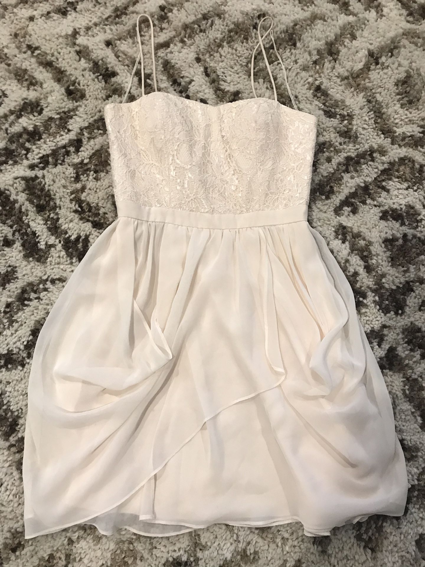 White dress with lace on top. I bought it at Bloomingdales for $150 only used once. I’m selling it for $60. No stains. Like new. Size 0 in women