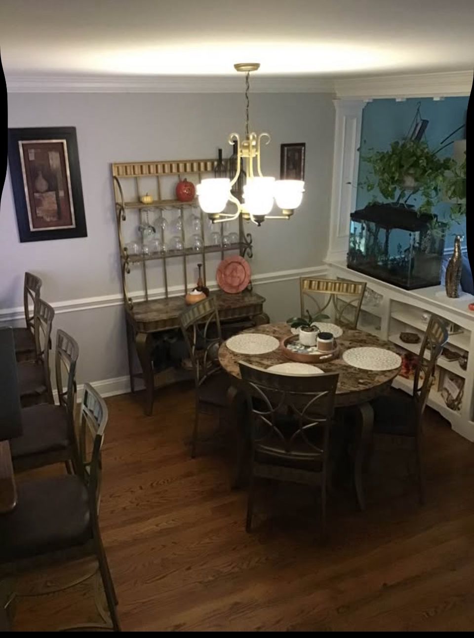 Dining room set, 11 PCs. Hutch W 42”,H 72”, D 18”. Table W 44” , H 31”. Dining chairs H 18”. Bar chairs. H 29””. Great condition .