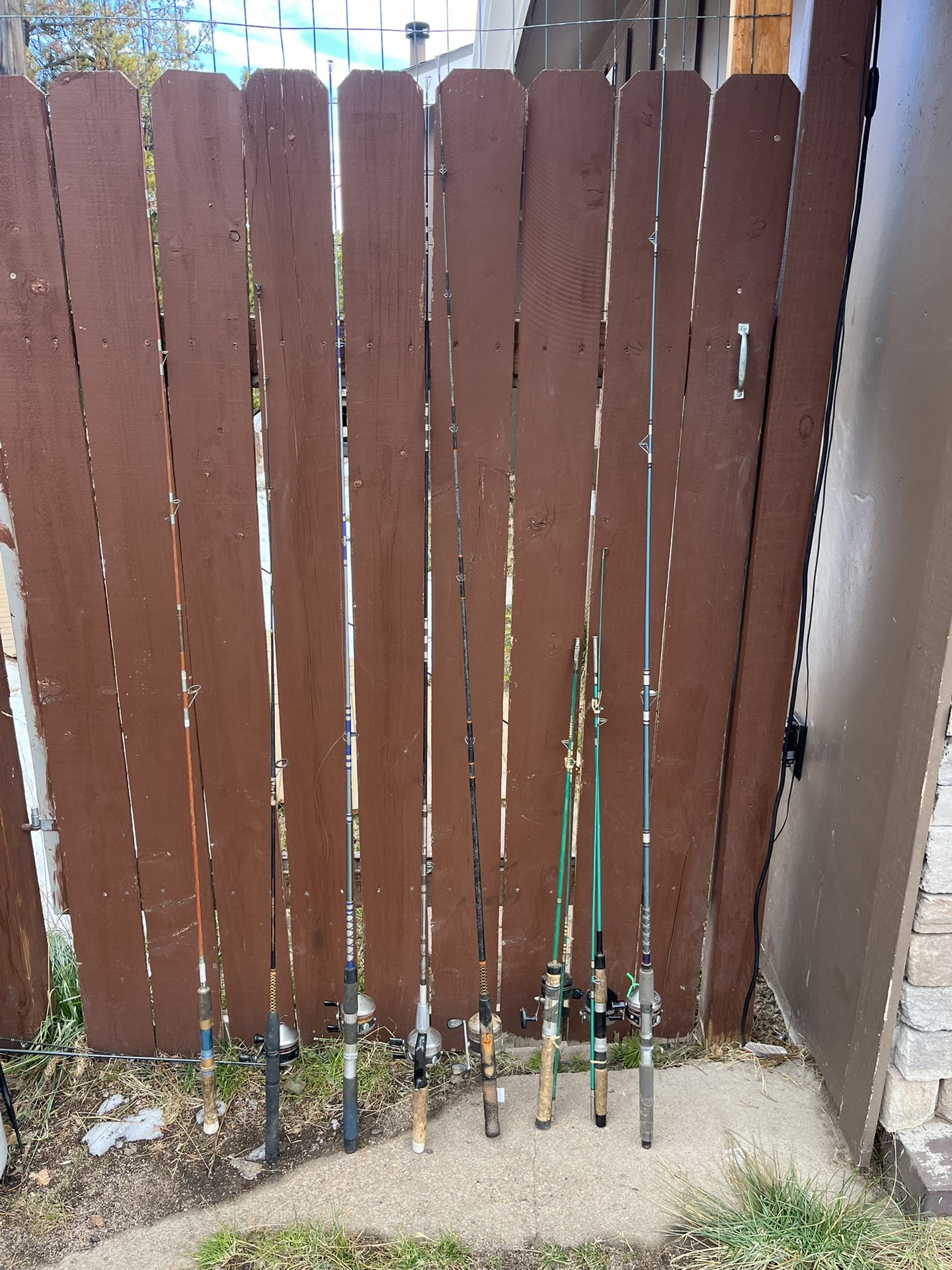 Various types of used fishing poles with reels( 7 total) $10 each or $40 for everything shown.