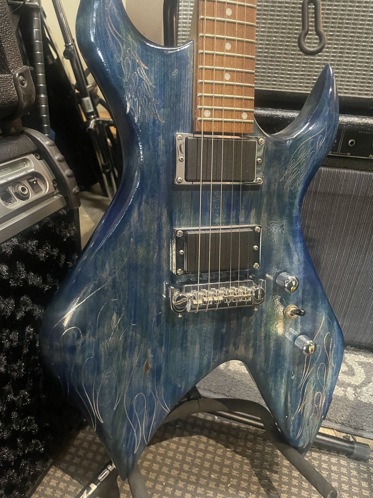 Electric guitar, with a custom denim wood stain / silver pinstripe finish. Everything works, plays great. I'll include a gig bag it fits in. 24fret neck - get it! (Maybe For fans of these tags: Heavy Metal, not Marshall, not Floyd Rose, Slayer, Metallica, Death, Shred)
