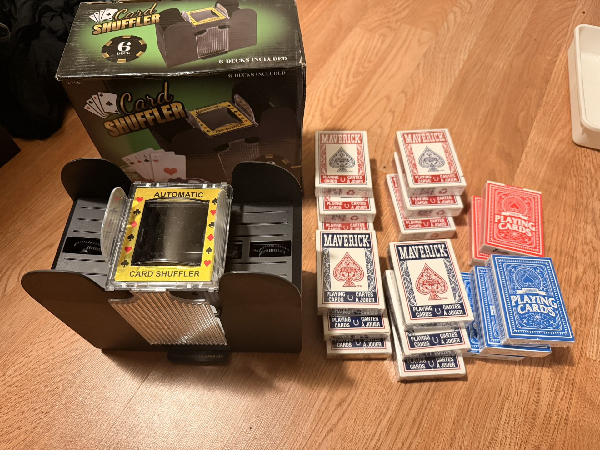 Card shuffler Includes 17 deck of cards in total - 6 red mavericks - 6 blue mavericks - 3 blue standards - 2 red standards Selling as a bundle