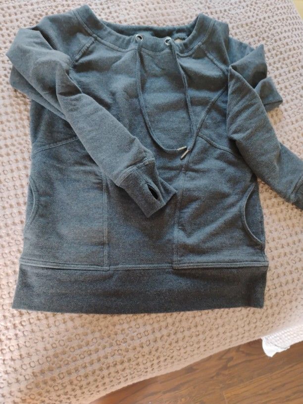 Gray sweatshirt. Size small junior/petite women. Boat neck with thumb holes in wrist so it doesn't roll up. Super warm and comfy. 95%cotton! 5%spandex
