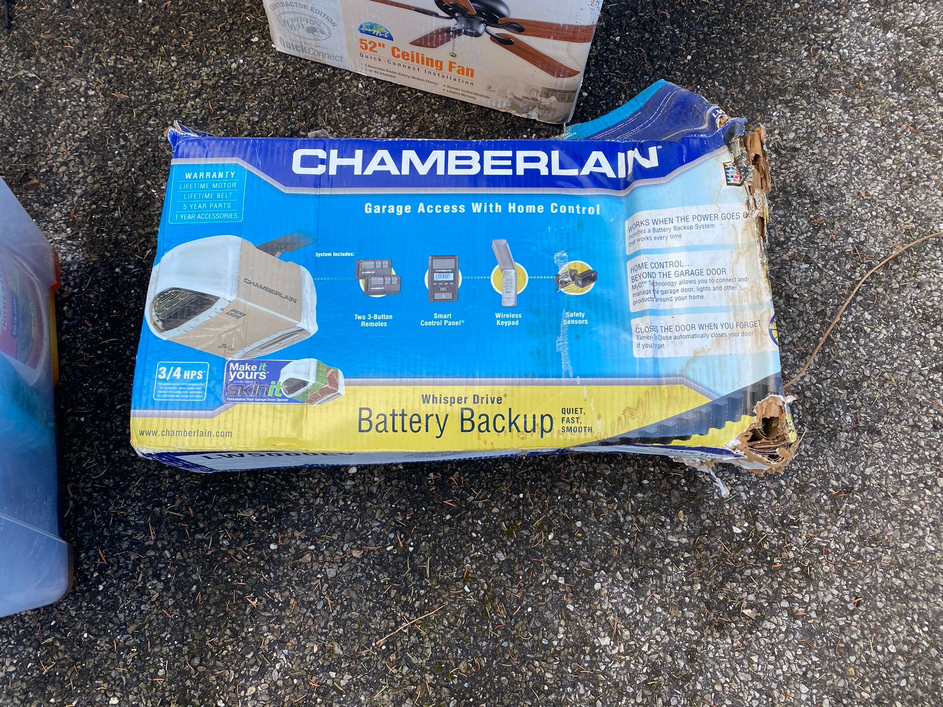 Chamberlain garage door opener model LW5000EV. Bought from Home Depot but never used. Box has water damage but all parts are there and new. Originally $275.