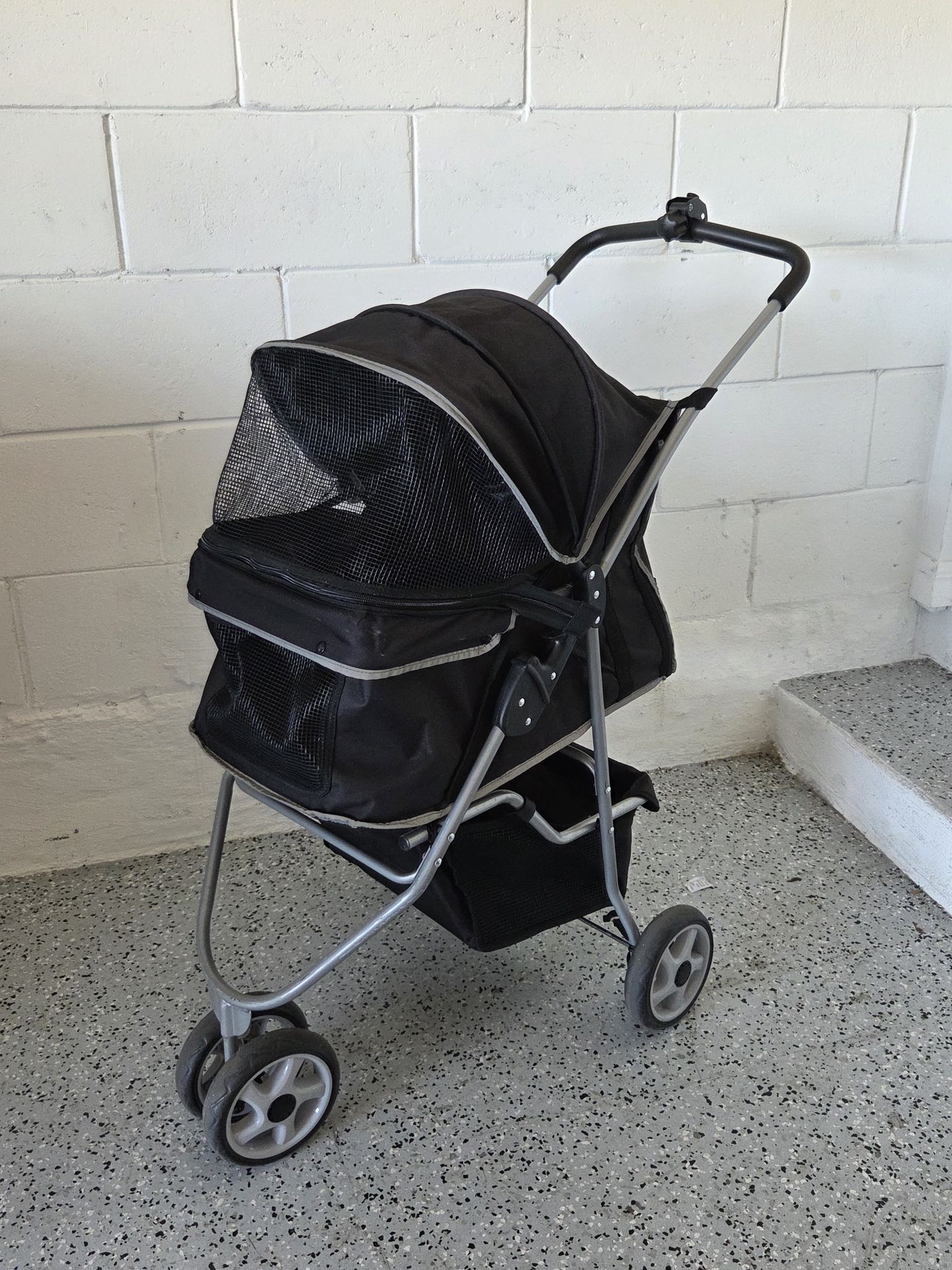 - $40 It is designed for transporting small dogs or cats. The stroller features a retractable sunshade canopy to provide protection from the sun or light rain. It includes a storage basket located underneath the main cabin for carrying pet essentials. The design incorporates mesh windows for ventilation and visibility. It has multiple wheels, with front swivel wheels for maneuverability and rear wheels equipped with brakes for safety. - $20 each, 2 like new totes for dog and cat. Expandable.