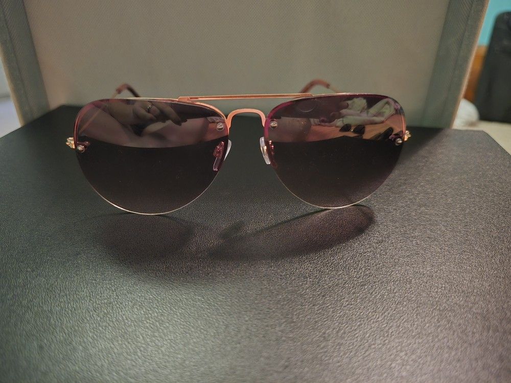 Oversized womens rimless aviators. Adjustable nose pieces, gold metal frame and hinges, rose tinted lenses.