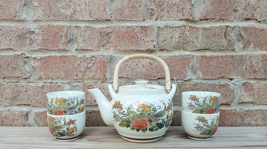 Made in Japan. Set of 1 teapot, and 4 cups. Teapot = approximately 7 1/4" long, 5" tall, and 5" wide. Cups = approximately 3" wide, and 2" tall. No chips, or cracks.