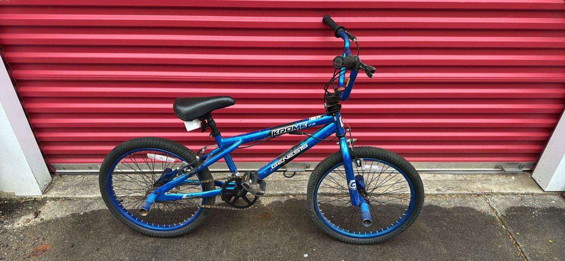 Located in Roswell Dynacraft Genesis 20" Krome 2.0 BMX Bike in blue Krome Genesis 2.0 20 inch BMX Bike Blue This Krome Genesis 2.0 BMX Bike in Blue is perfect for boys who love to ride. With a 20 inch wheel size, adjustable seat and pegs, it is equipped with all the features needed for a fun ride. The handlebar type is BMX Bar, and it has a single speed. The brake type is caliper brake and V-brake. The bike has a frame size of 20 inches. This bike is suitable for all levels of riders and gives an excellent BMX experience. Pre owned item might contain minor scuffs or scratches or rust Needs new tires and tubes $55 OBO Just trying to clear out storage unit