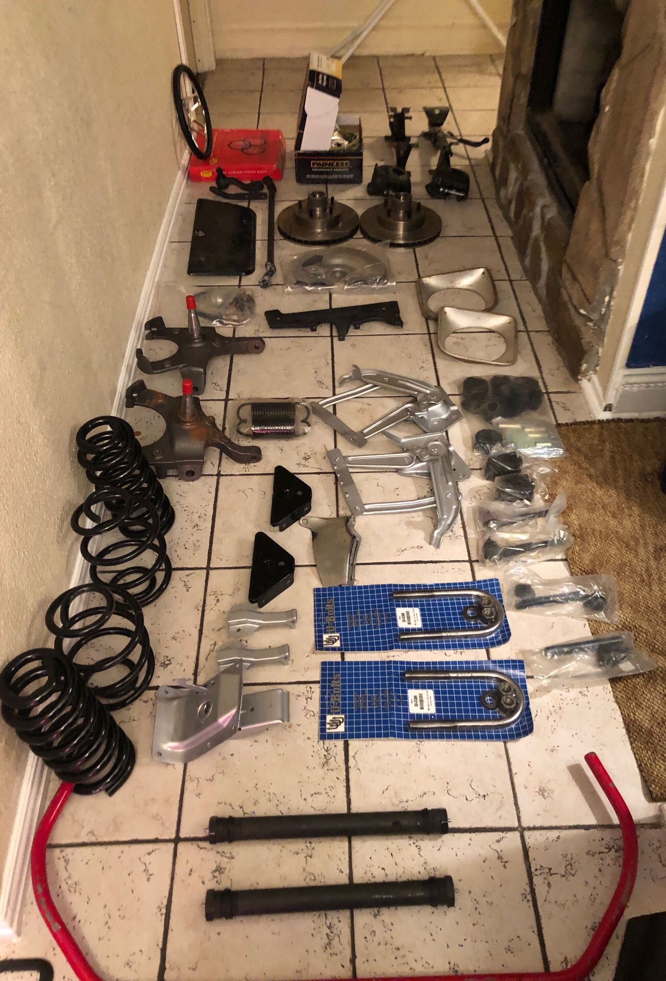 Complete wiring harness and steering wheel never used. Most all parts are new, drop spindles, radiator support holders, front disc brakes with new calipers, original bench seat brackets, hood support holders with new springs and many more new items. Serious inquiries only. Don’t waste my time asking if it’s still available if you see it up and not sold it’s available.