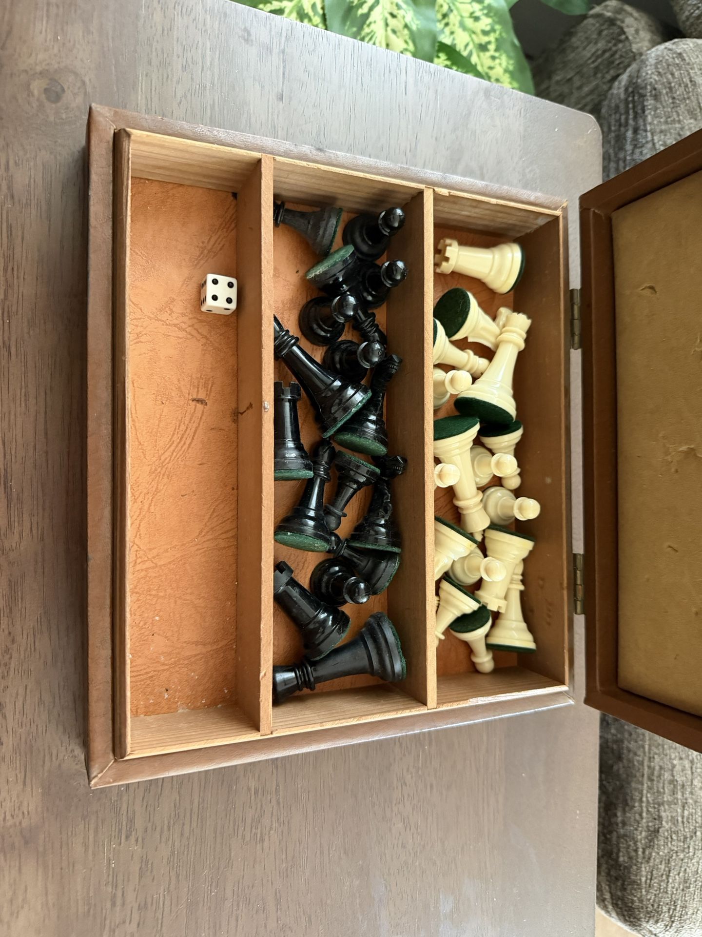 Selling off items from my chess collection Full set of chess pieces (and one die for some reason) Comes in cool little box Cash only please Pick up in atco, nj