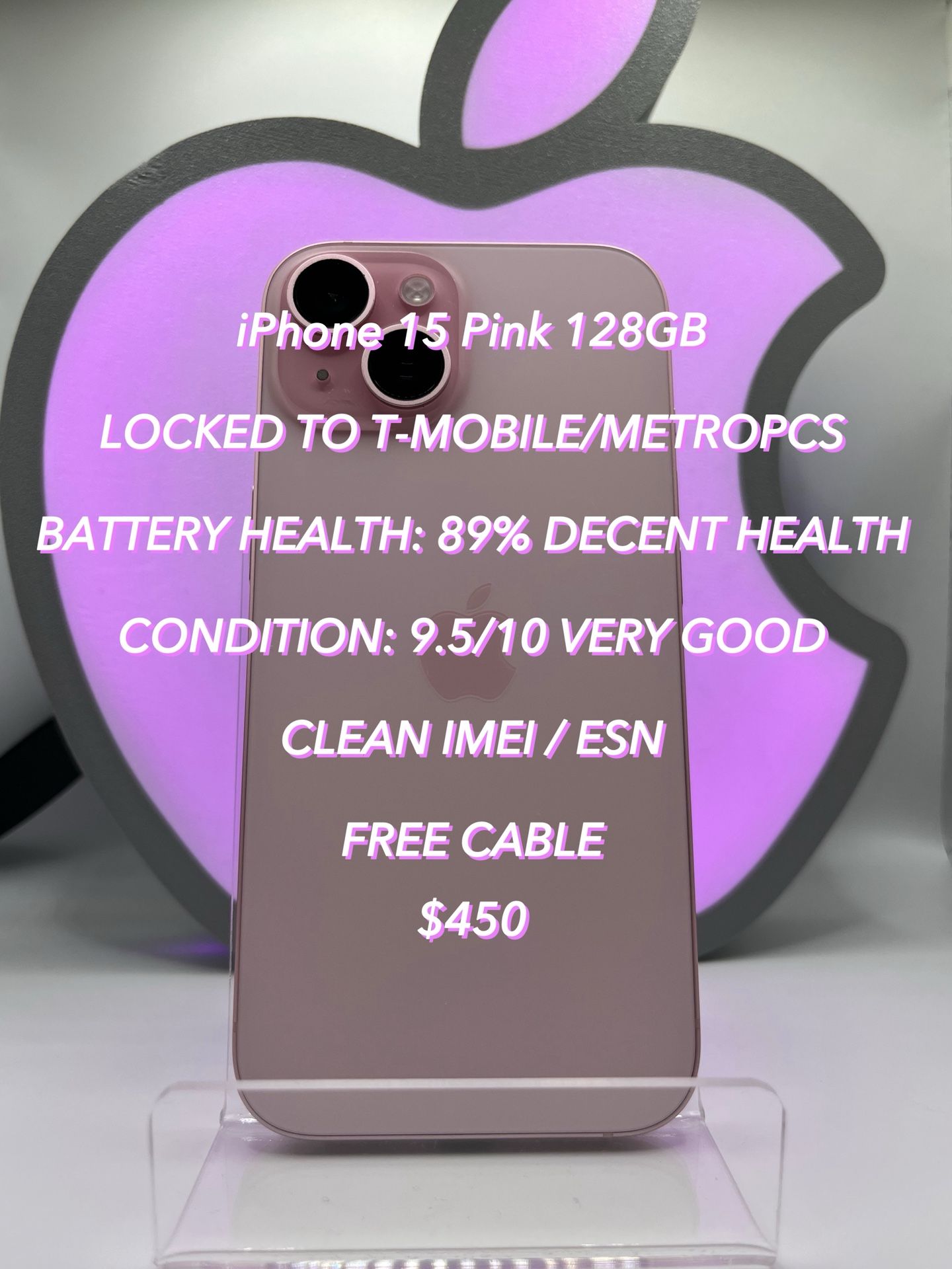 iPhone 15 Pink Carrier: LOCKED TO T-MOBILE/METRO Also: Mint, Ultra, Sprint, Google Fi, US Mobile Storage: 128GB Condition: 9.5/10 VERY GOOD Battery: 89% HEALTH NO ICLOUD LOCK / ACTIVATION LOCK CLEAN IMEI / NOT BLACKLISTED Price is FIRM - $450 available for pickup or meetup. Test the ring tone, camera, Face ID, speakers, phone call, whatever you like. π Everything is used purchased second hand, all sales final unless a warranty is directly stated.