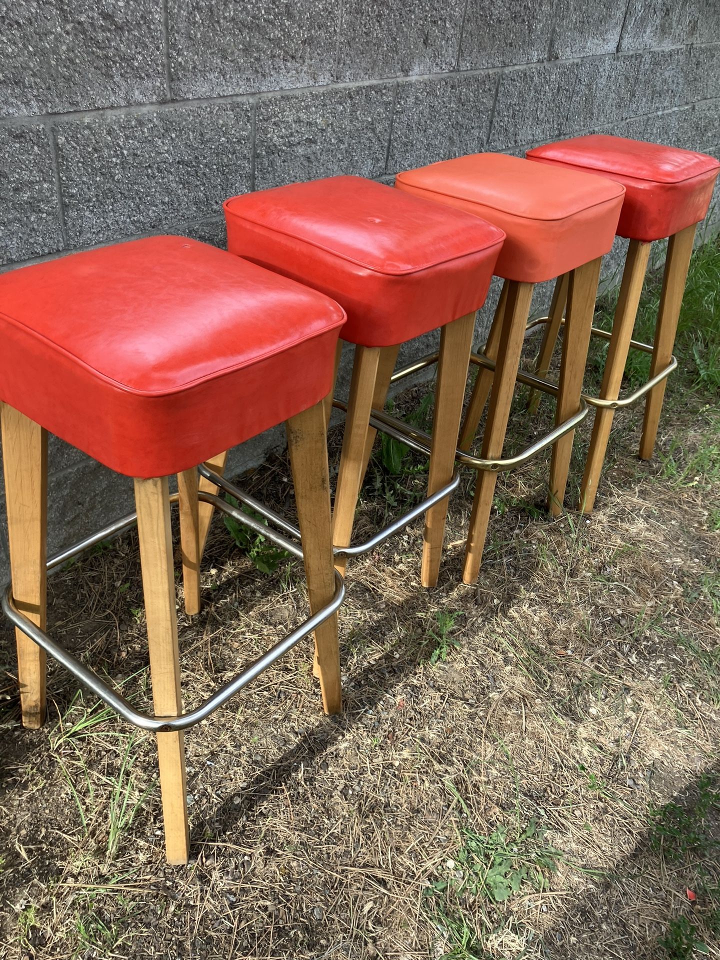 Very nice vintage condition with one stool seat, a lighter orange than the rest? And 2 seats have small, but noticeable repairs the size of a nickel Local delivery available for $20 All 4 bar stools for $99