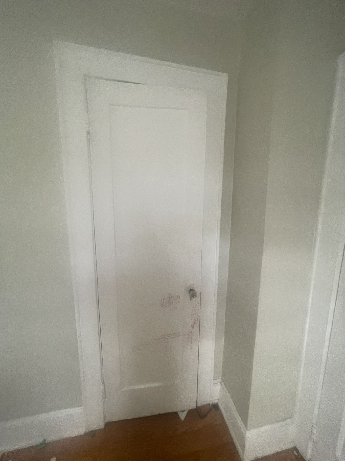 Wood closet door with antique knobs the top has been sanded it is a little bit wavy or part of the door knob has paint on it. Width is approximately 24 inches across. Height is approximately 80 tall but slightly wavy from some sanding. Some crayon and marker markings on the door